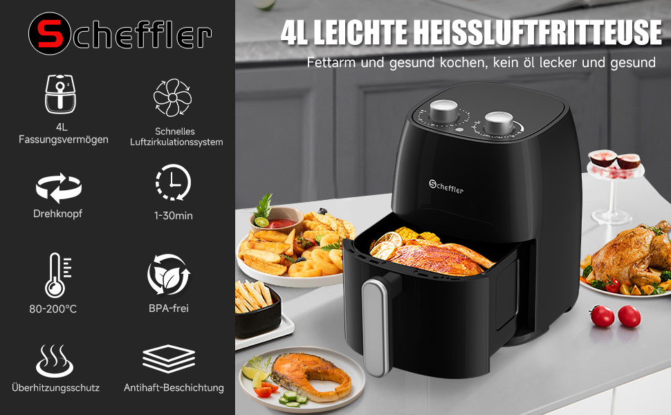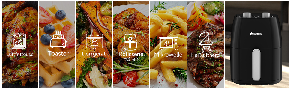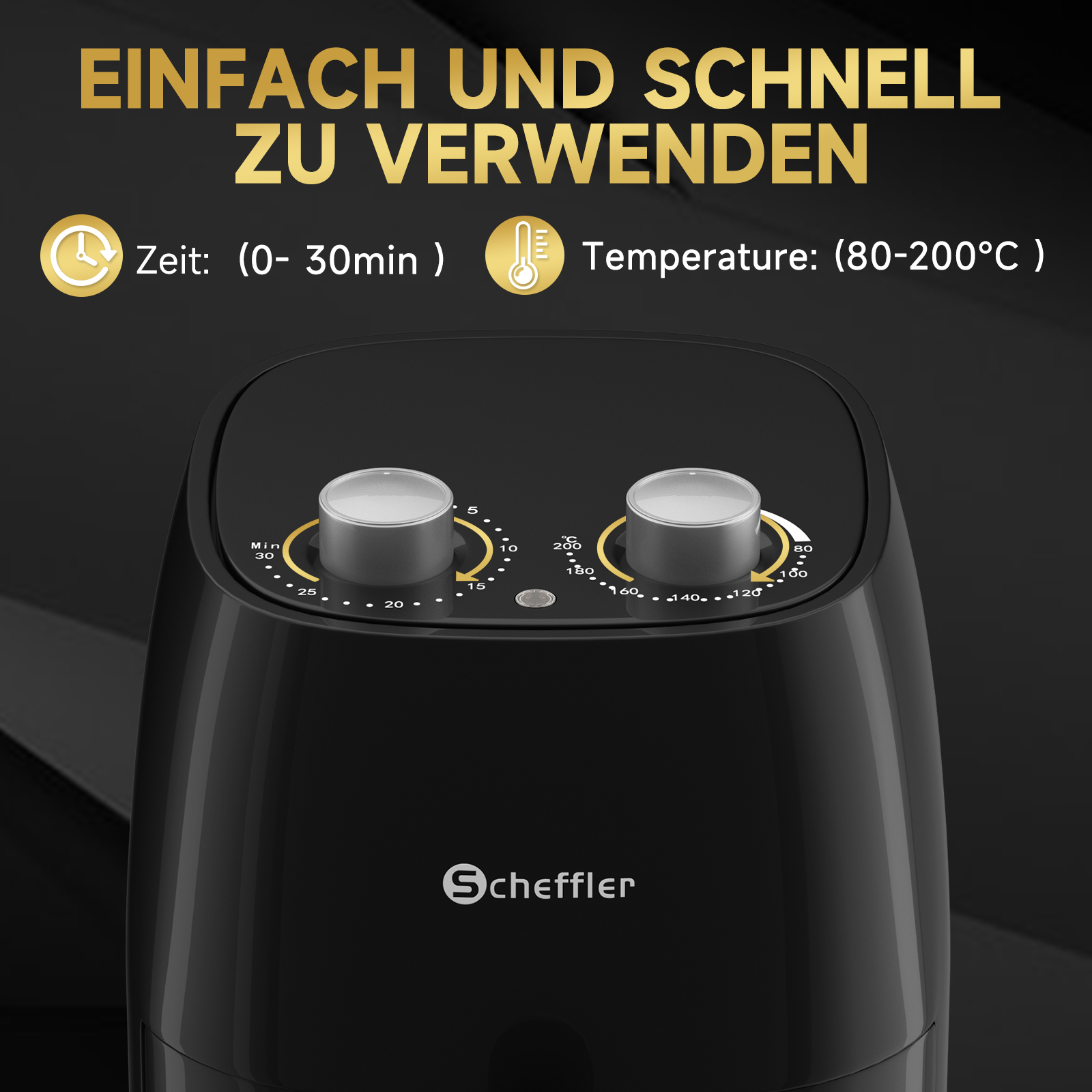 Compared to touchscreen operation, this hot air fryer is easier to understand, easier, faster and more durable. Simply set the time (1 to 30 minutes) and temperature (80 C to 230 C) with the rotary knob and the included instructions include simple recipes. You can also let your imagination run wild to pamper friends, family and yourself with delicious and healthy treats!