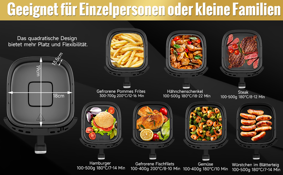 with a capacity of 4 litres, you can prepare up to 800 g of chips in the air fryers XL - enough to feed a family of three! The simple and stylish design of the black hot air fryer decorates your kitchen; the small size also fits in any kitchen cabinet and is a must have for your first apartment, smaller kitchen, dorm living or travelling with the motorhome/motorhome.
