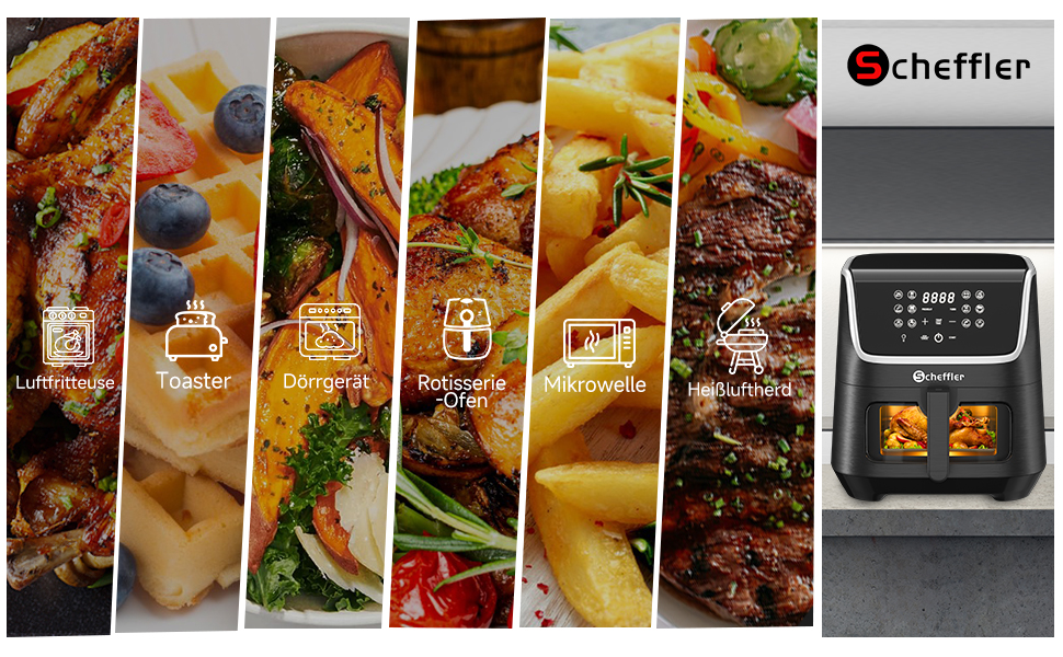 thanks to the unique transparent viewing window and the integrated lighting of the Scheffler hot air fryer, you can check the status of the food at any time without having to pull out the basket. The large capacity of 5.5 litres is enough to cook a whole chicken or 1000 g of chips, making it ideal for families of 2 to 6 people. A square design basket offers more space and flexibility when cooking than a round design basket.