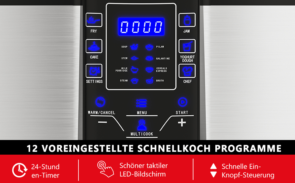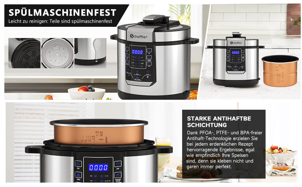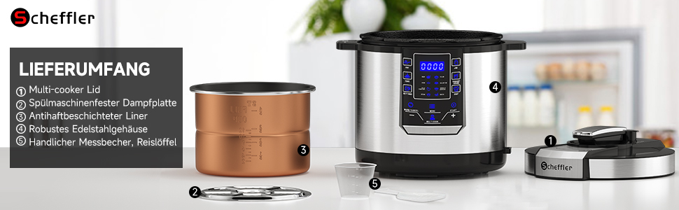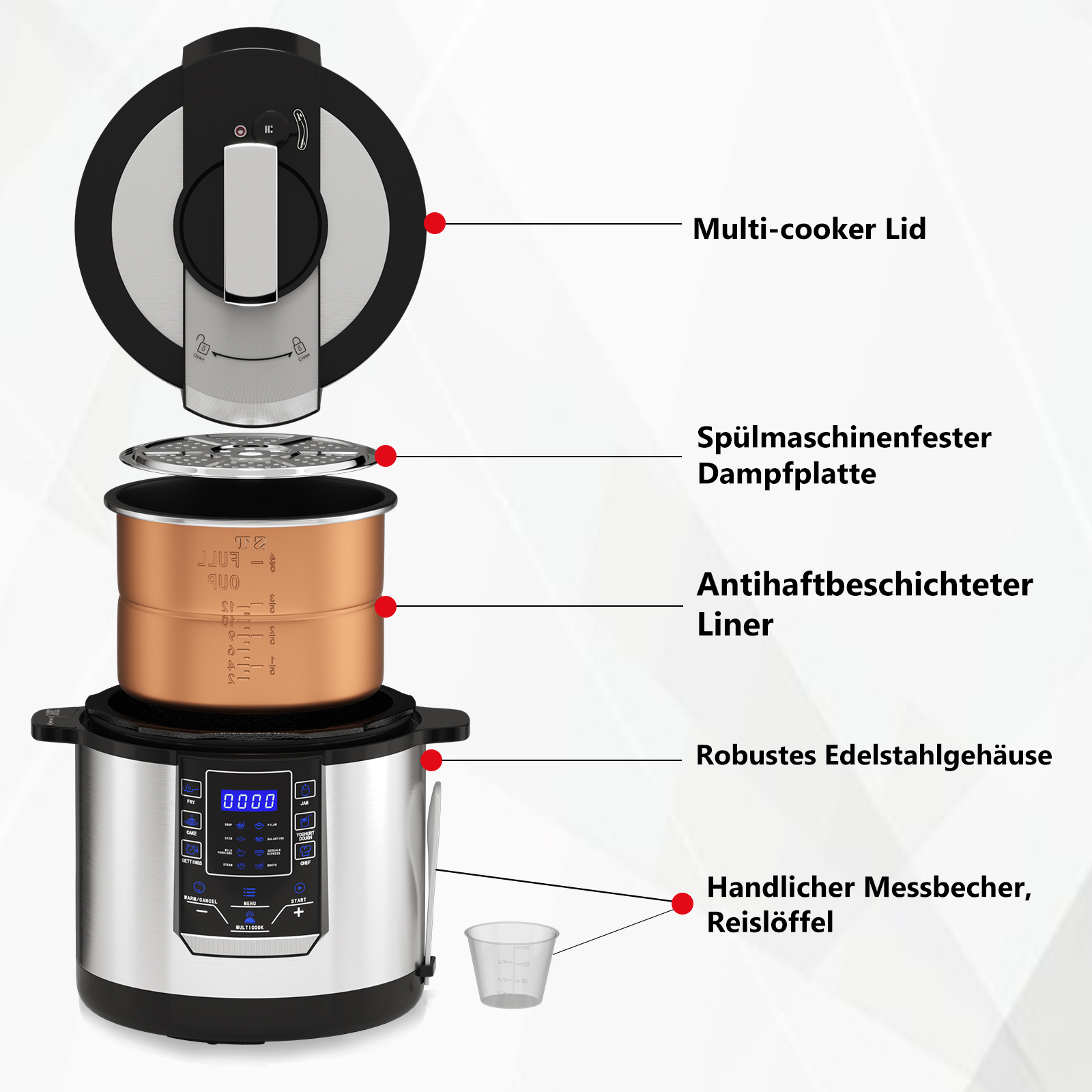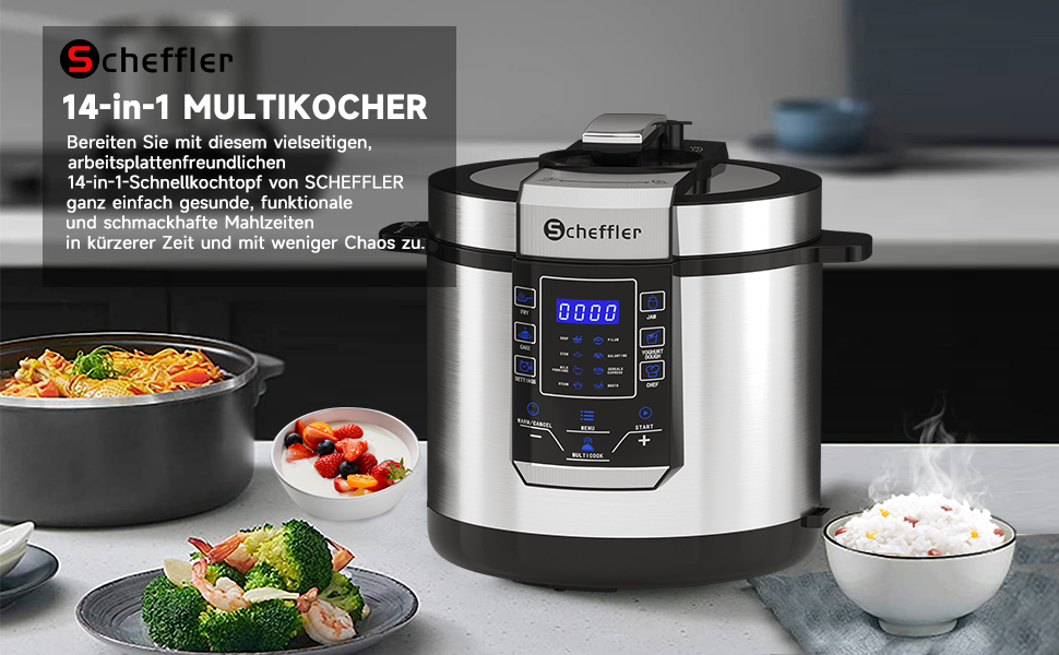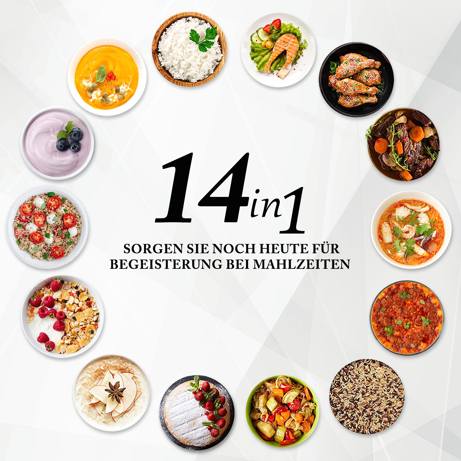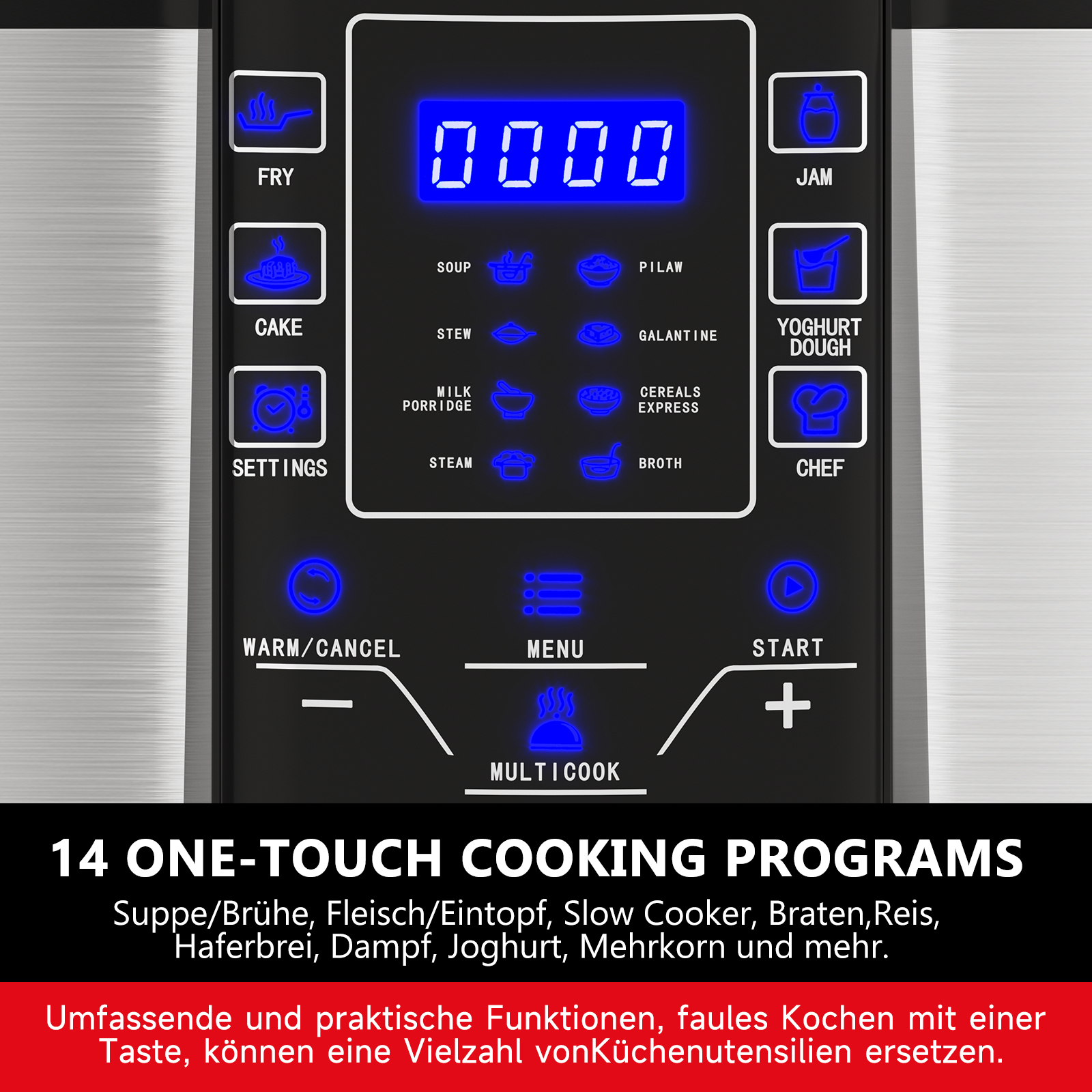 Cooker with cooking function comprehensive and practical functions, one-button lazy cooking that increases cooking speed by 40%. Start 14 smart programs at the touch of a button: soup/broth, meat/stew, slow cooker, roast, rice, porridge, steam, yogurt, multigrain and more. The fully sealed kitchen preserves the nutrition and original taste of the food.