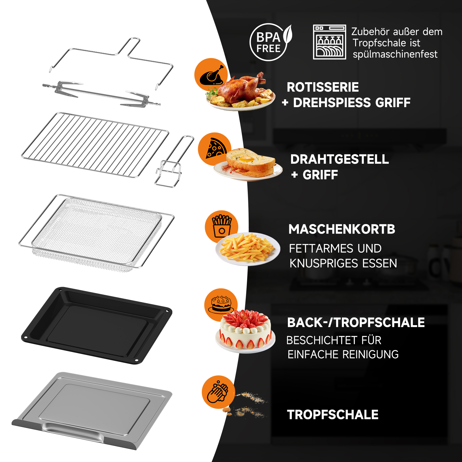 Thanks to the 1700W hot air oven dual fan technology and 6 upper and lower heating elements, not only is maximum heat flow achieved quickly, but the air can also circulate around the food. The HOMELUX hot air fryer cooks faster and more evenly, crispier and juicier.