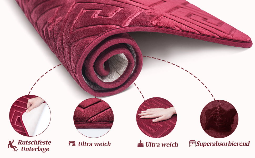 the set consists of 1 x 50 x 60 cm and 60 x 100 cm bath mats. Our bath mats are made from 100% polyester. We use high-quality polyester material. The back is backed with a non-slip PVC base. The thick and soft contact surface provides a super comfortable feeling and helps reduce pressure on your feet. Enjoy the comfort and say goodbye to the terrible fibre waste!