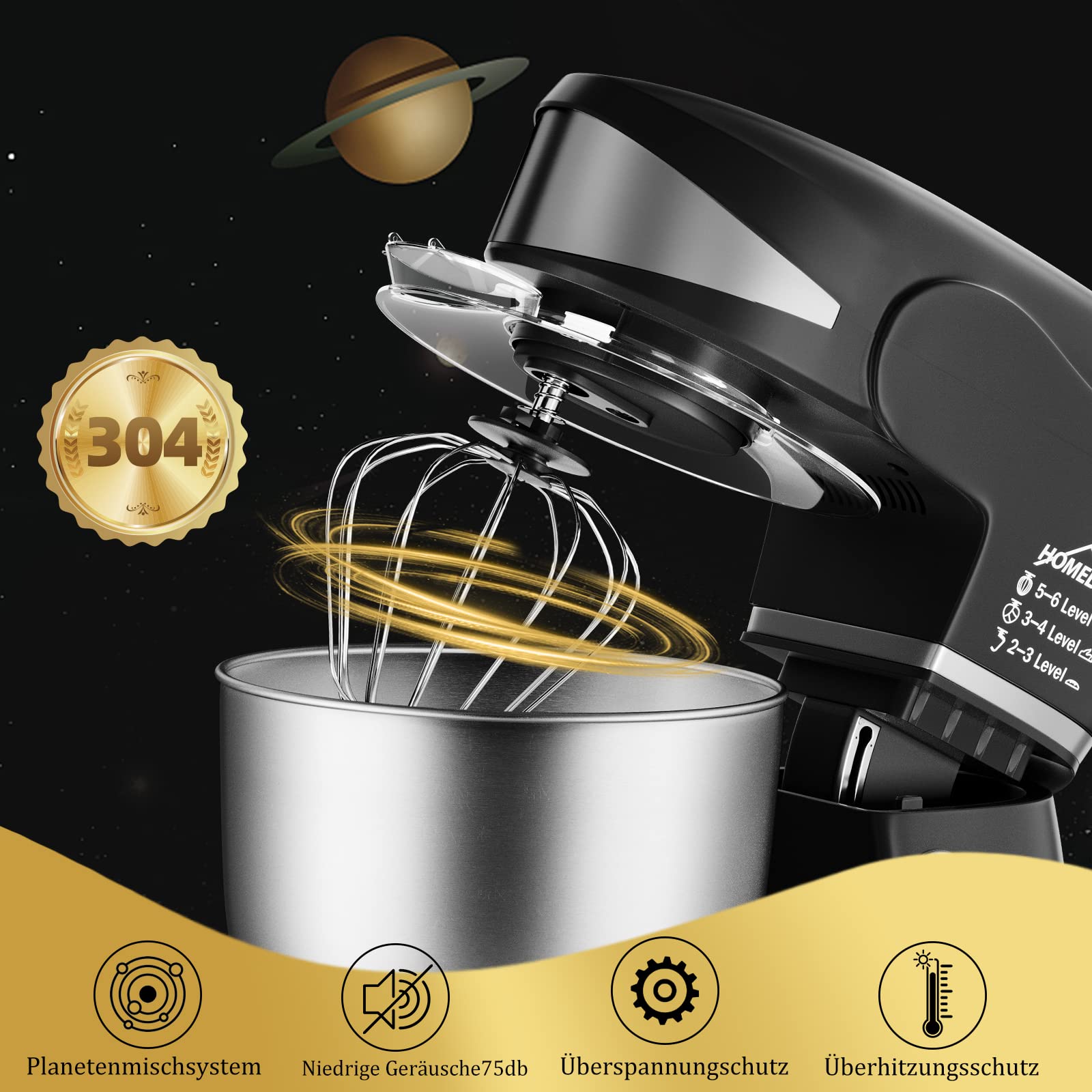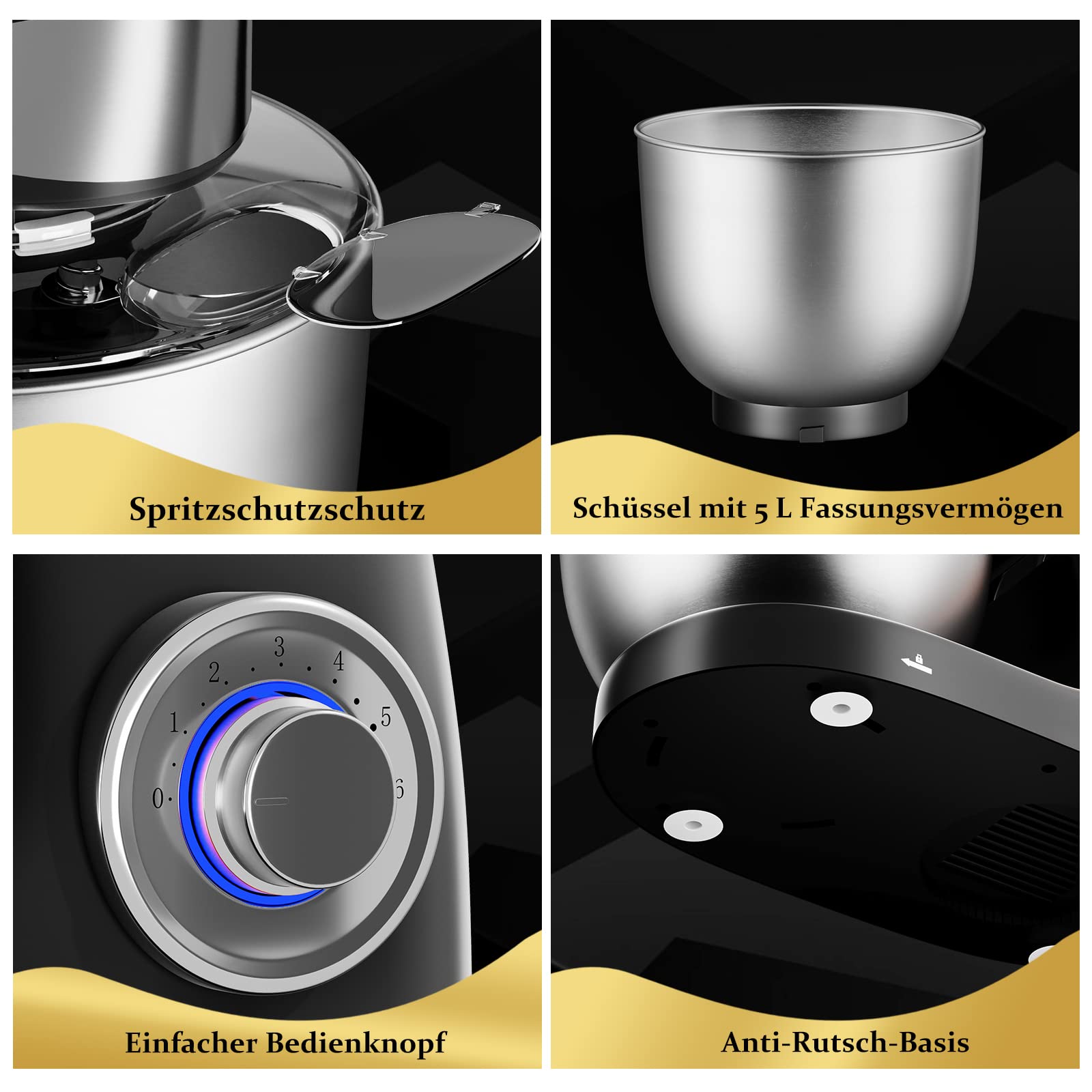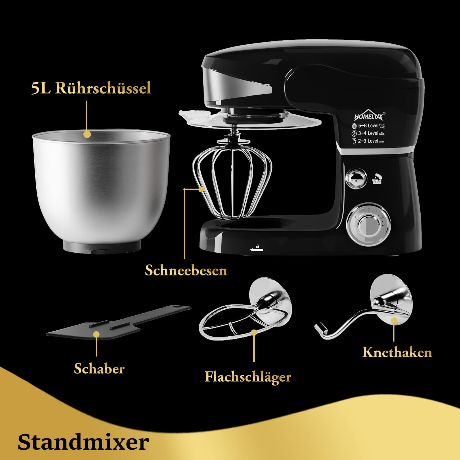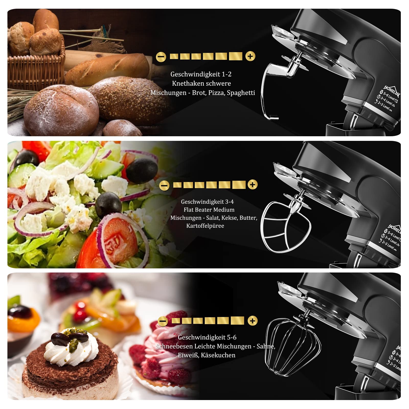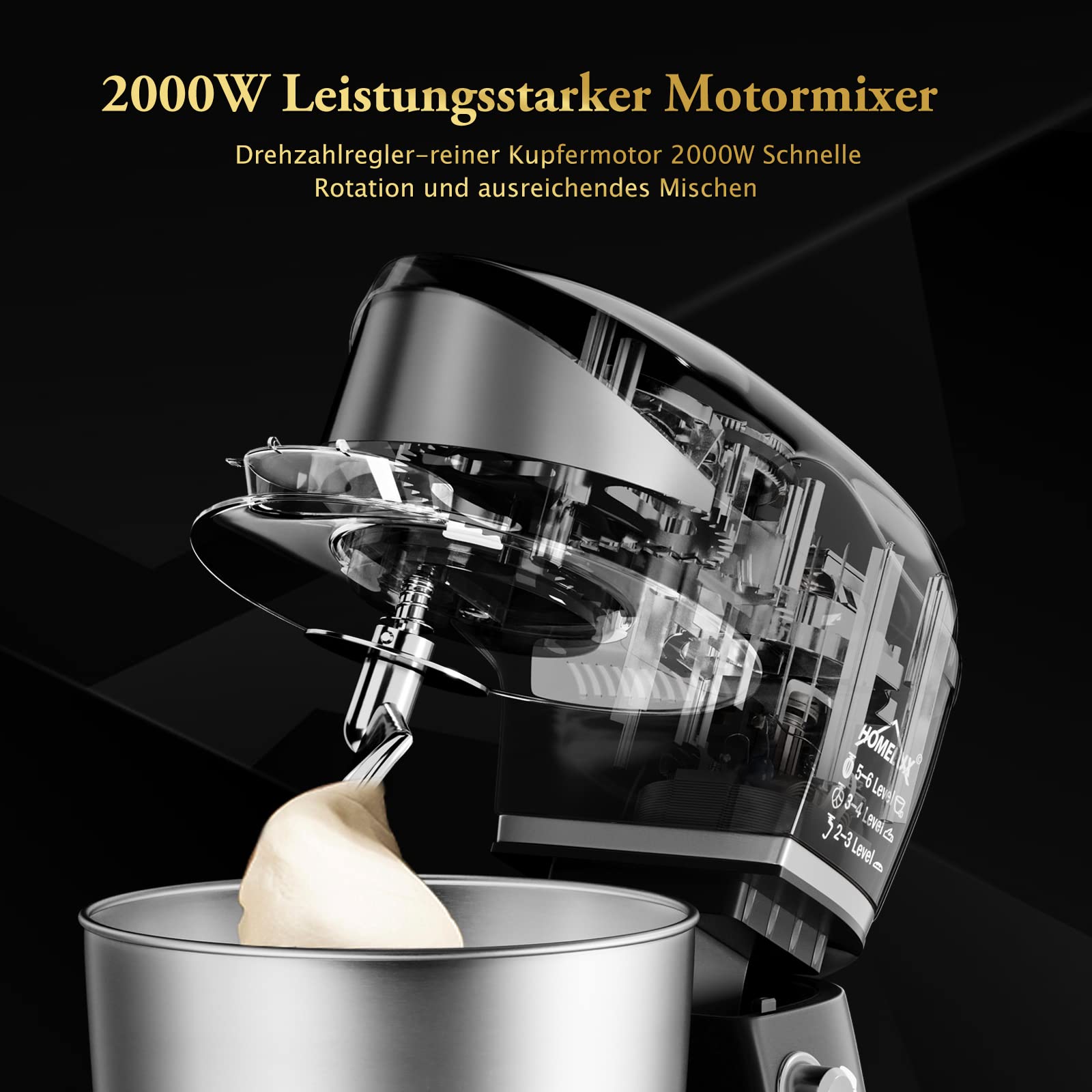 HOMELUX SC206 2000 W Food Processor Multifunctional Kneading Machine, 5 L Kneading Machine Including 3-Piece Patisserie Set and Splash Guard, 6 Speeds with Stainless Steel Bowl Dough Machine SC206 (Black +Sliver)