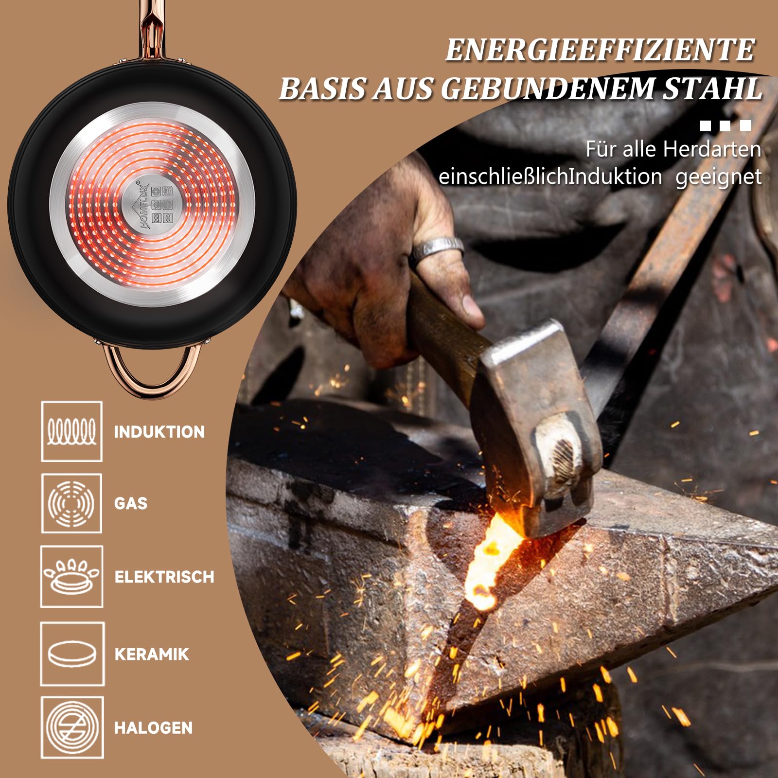 the cookware set has a stylish ribbed surface and a robust aluminium body with a 3 mm thick construction. It heats up quickly and distributes heat evenly for excellent cooking results. It is compatible with gas, electric, ceramic, glass, stove, induction hobs and more.