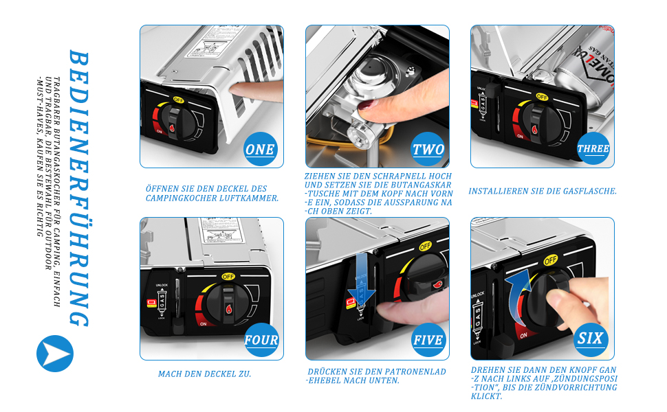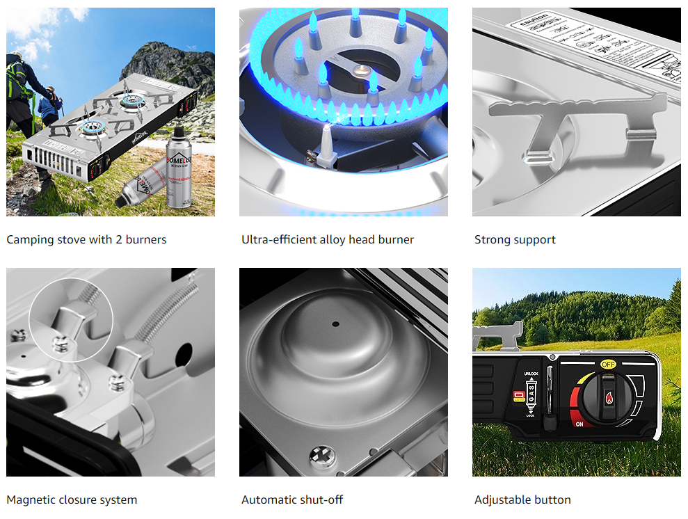 the safe flameout setting has an external sealing system to prevent gas leakage. The windproof design and explosion-proof oven core have good heat dissipation performance and the flame is more stable. Please rest assured to use our product. Piezo ignition design with safety lock for easy use.