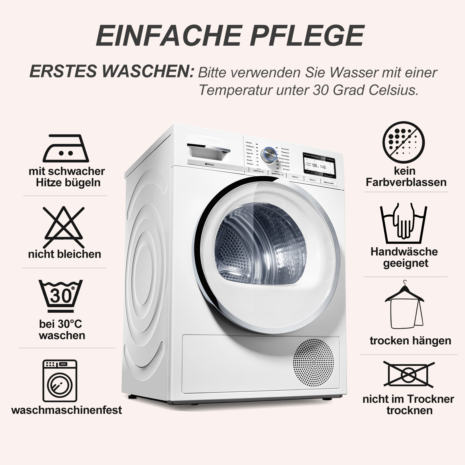 please wash before use. Use water at a temperature below 30 degrees Celsius for the first wash. Iron at low temperature, do not bleach, do not tumble dry. Hand washable, machine washable, dark and light colours must be washed separately.