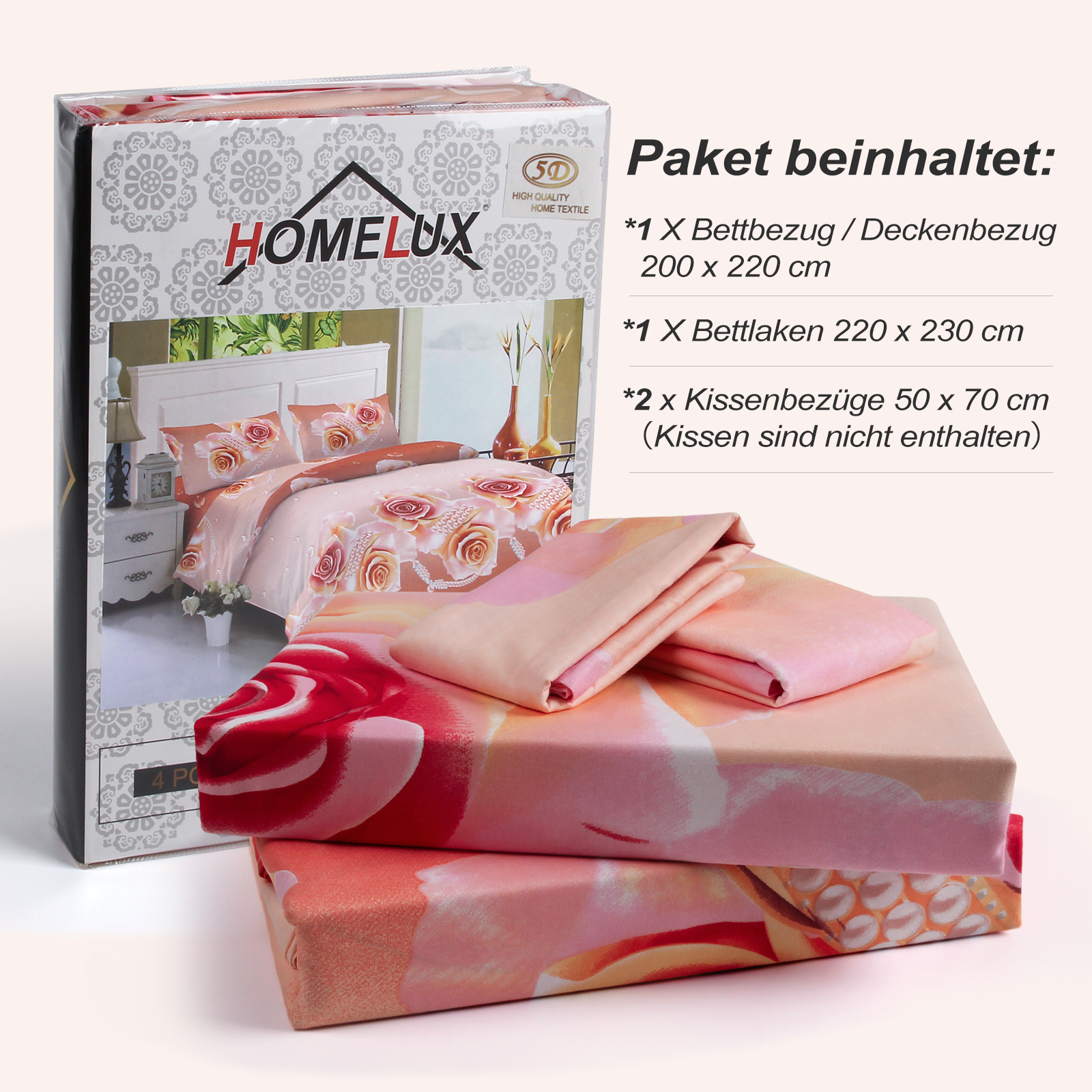 Homelux bedding set (1 x 200 x 220 cm duvet cover & 1 x 220 x 230 cm flat sheet & 2 x 50 x 70 cm pillowcases). Due to the light when shooting and the different brightness of the display, there may be a small colour difference when you receive the 4-piece set.Please do not hesitate to us. contact if you have any questions. to use or have quality problems.