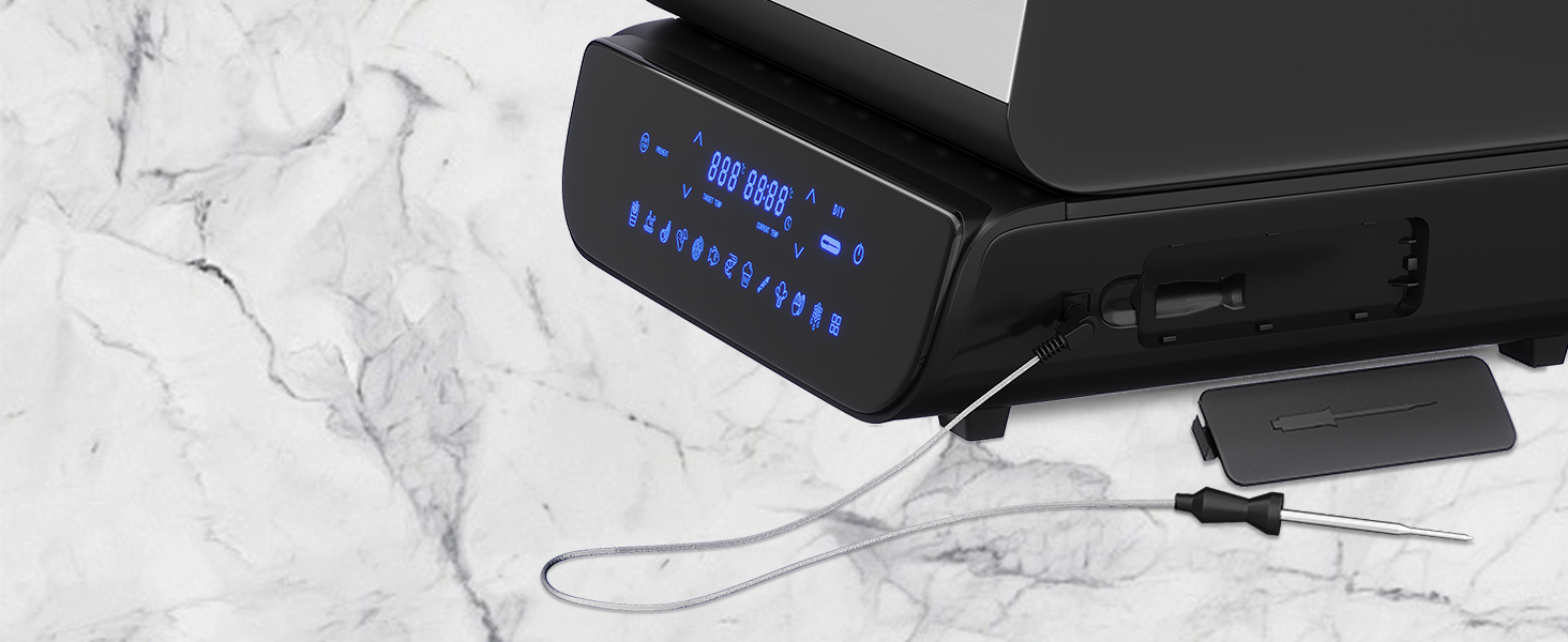 continuously monitors the food temperature for optimum cooking results. Adjustable temperature range from 125-230°C for different cooking levels.