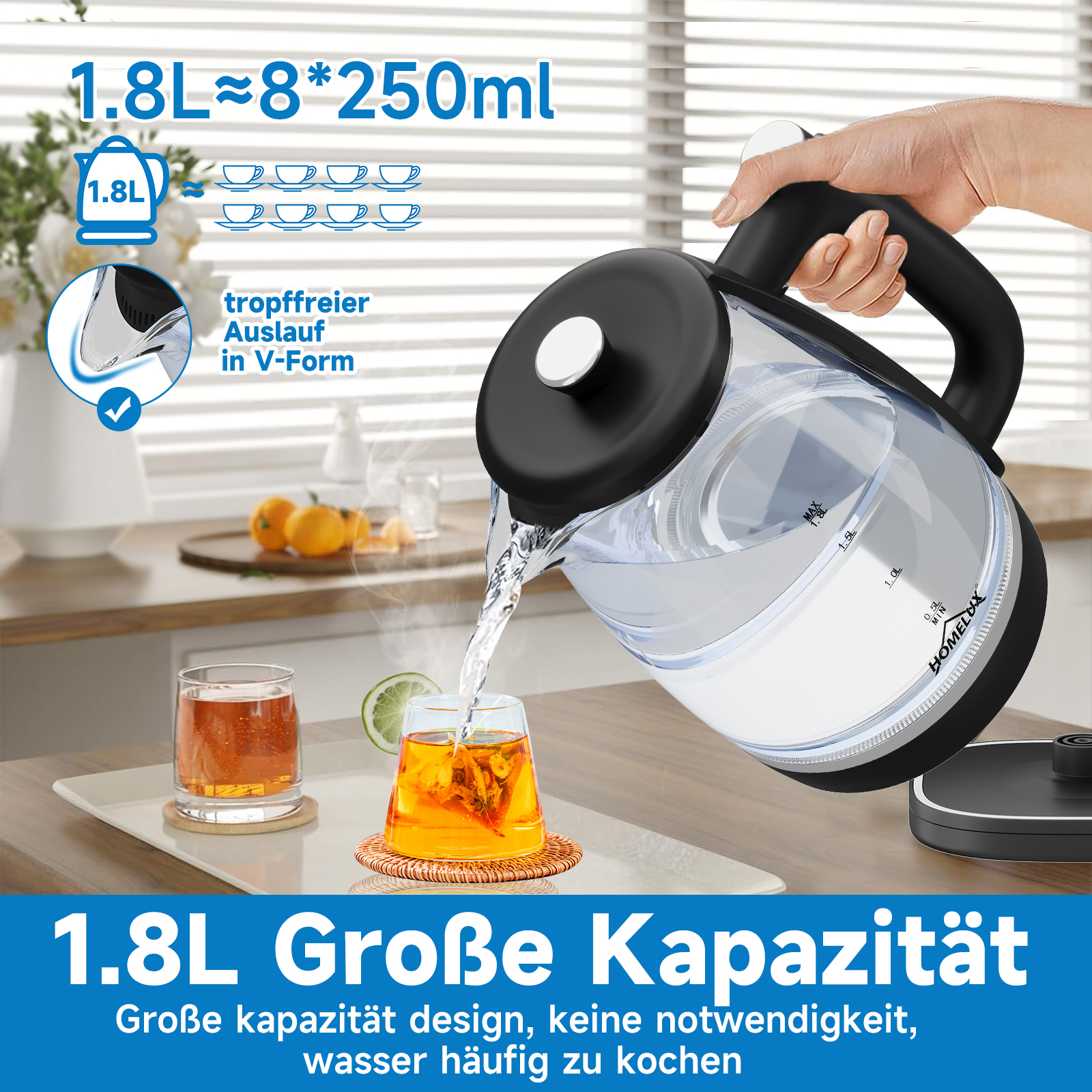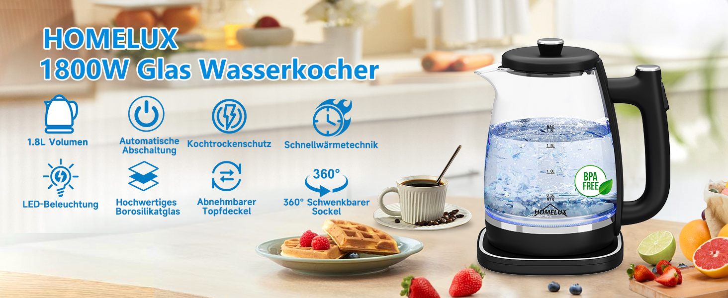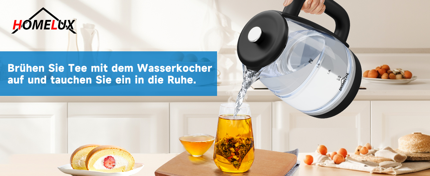 The homelux kettle is made from high-quality materials. The strong and durable borosilicate glass is very stable, resistant to heat and cold, not easy to break and easy to clean. Built-in heating plate made of food-grade stainless steel, non-toxic, odorless and BPA-free, so you always get healthy drinking water!