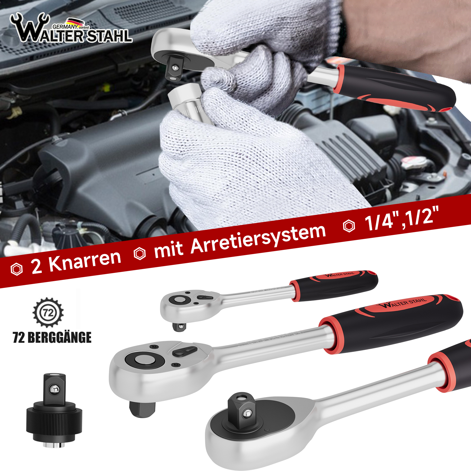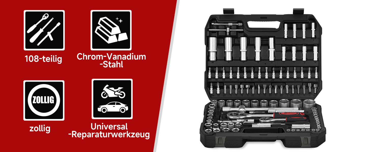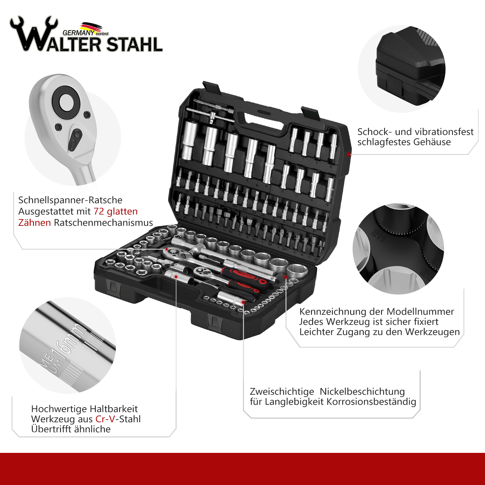 WALTER STAHL 108-piece socket set and is perfect for almost all your DIY and car repair needs.Including 1/2“&1/4” deep sockets x13, 1/2“&1/4” E-Torx sockets x13 ,1/2“ & 1/4 ‘flat sockets x30,1/4’& 8mm bits x35,1/2”& 1/4 “slide and extension bar x5 ,Other tools x10,1/2”&1/4 “reversible ratchet x2