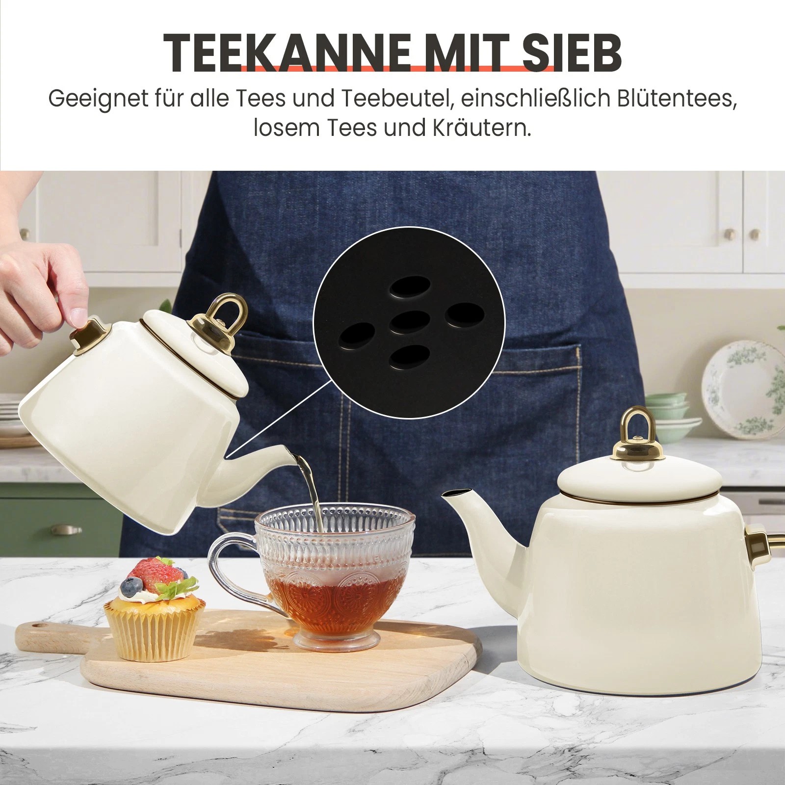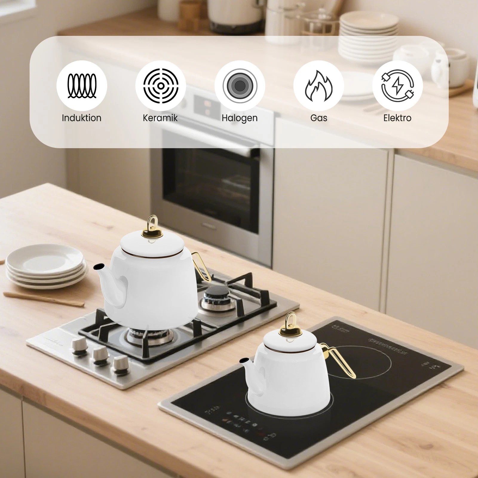 This induction teapot set is compatible with induction, gas, electric, and ceramic stovetops. Please use the tea kettle on low or medium heat, as it heats up very quickly and saves energy.