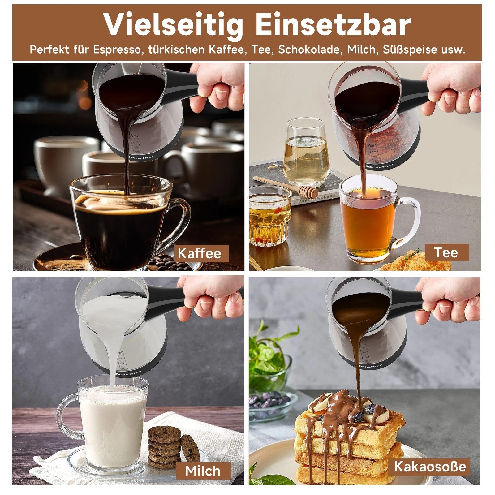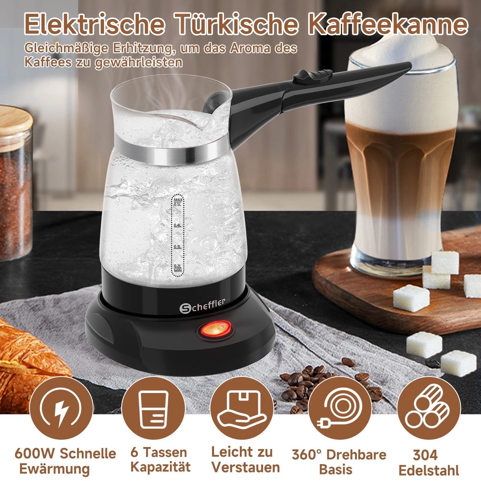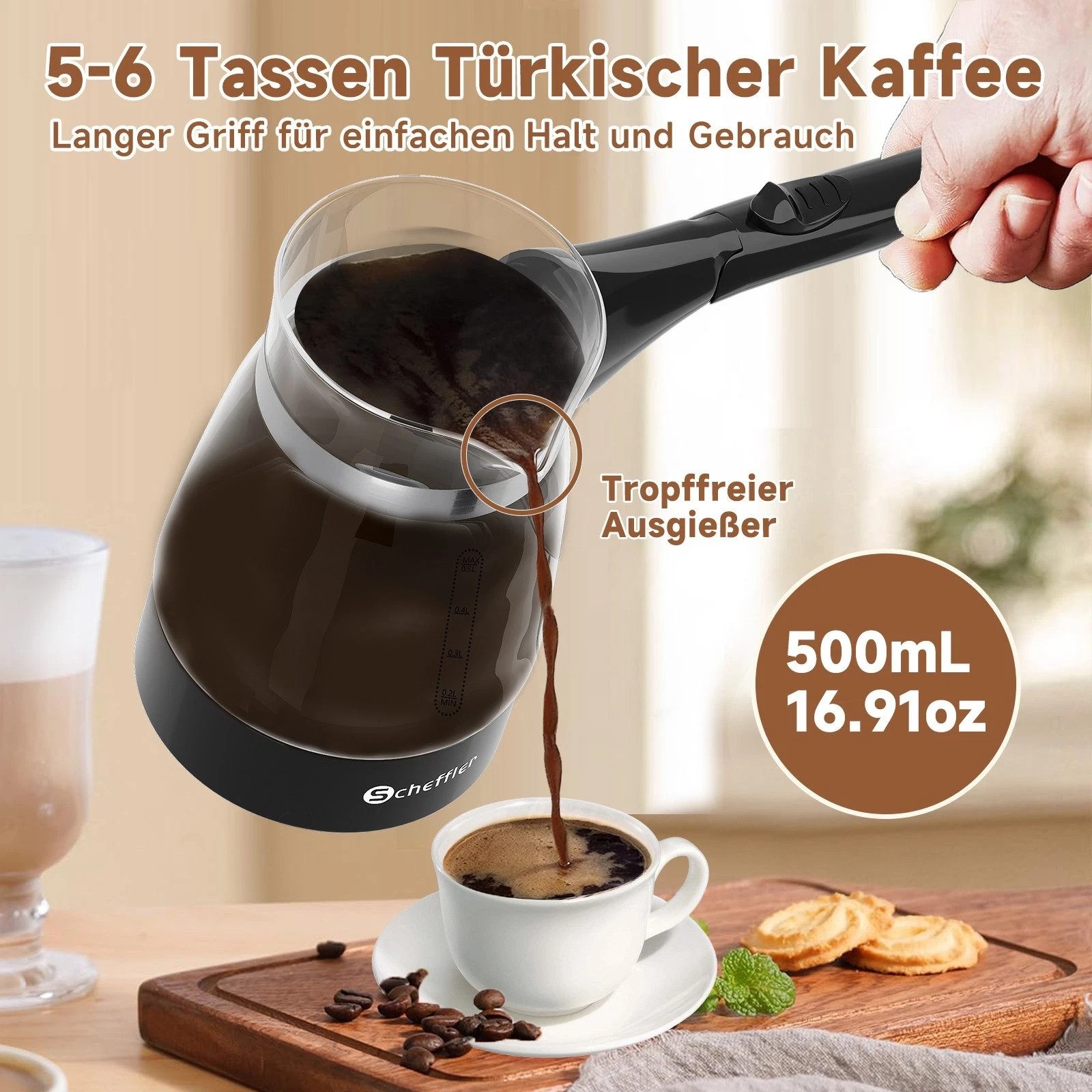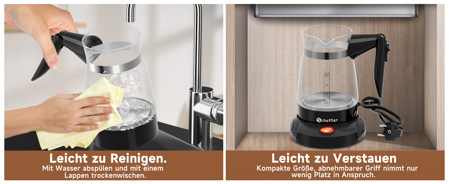 The 600 watt electric appliance prepares up to 5-6 cups of Turkish mocha, espresso and coffee in the 0.5 L pot, is suitable as a kettle and also heats milk effortlessly and quickly.