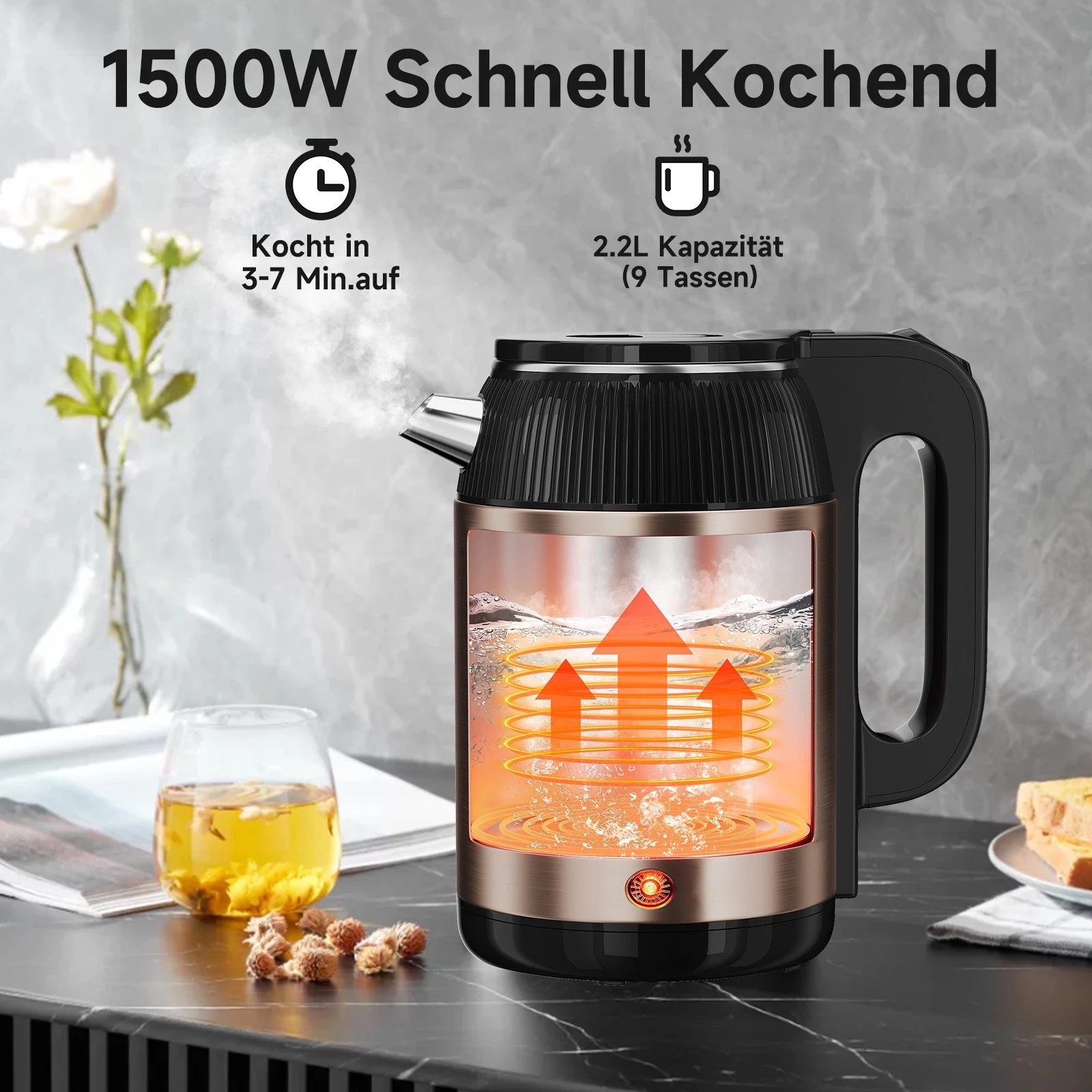 The 360° rotating base allows for easy and flexible placement of the kettle on the heating element. This makes the kettle particularly user-friendly and convenient for everyday use.