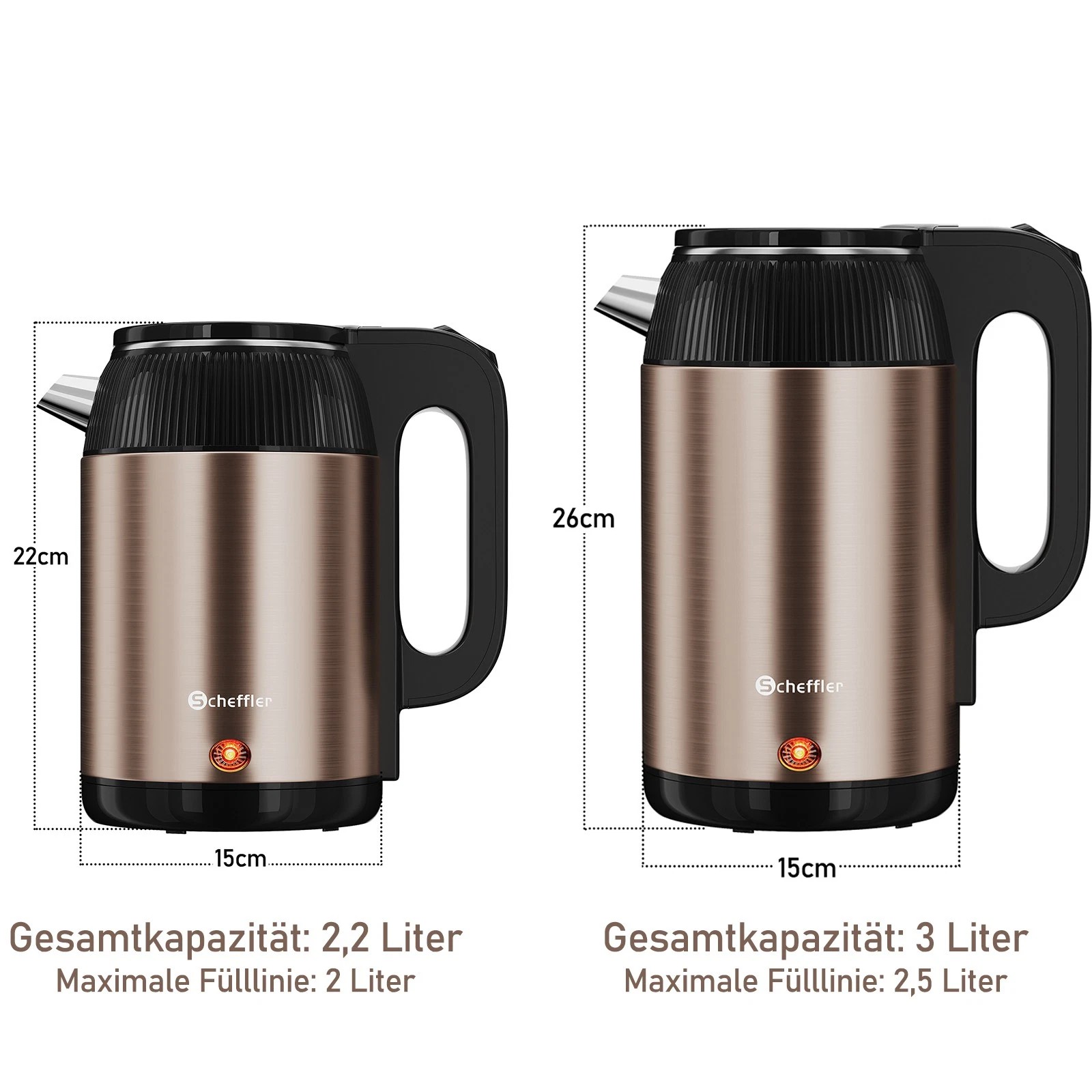 The kettles are available in two high-performance versions: 1500 watts with a 2.2 liter / 3 liter capacity. Both models ensure fast and efficient water heating.