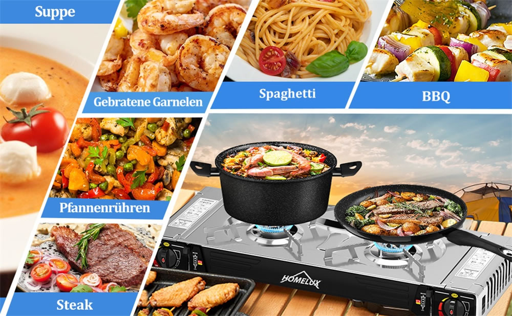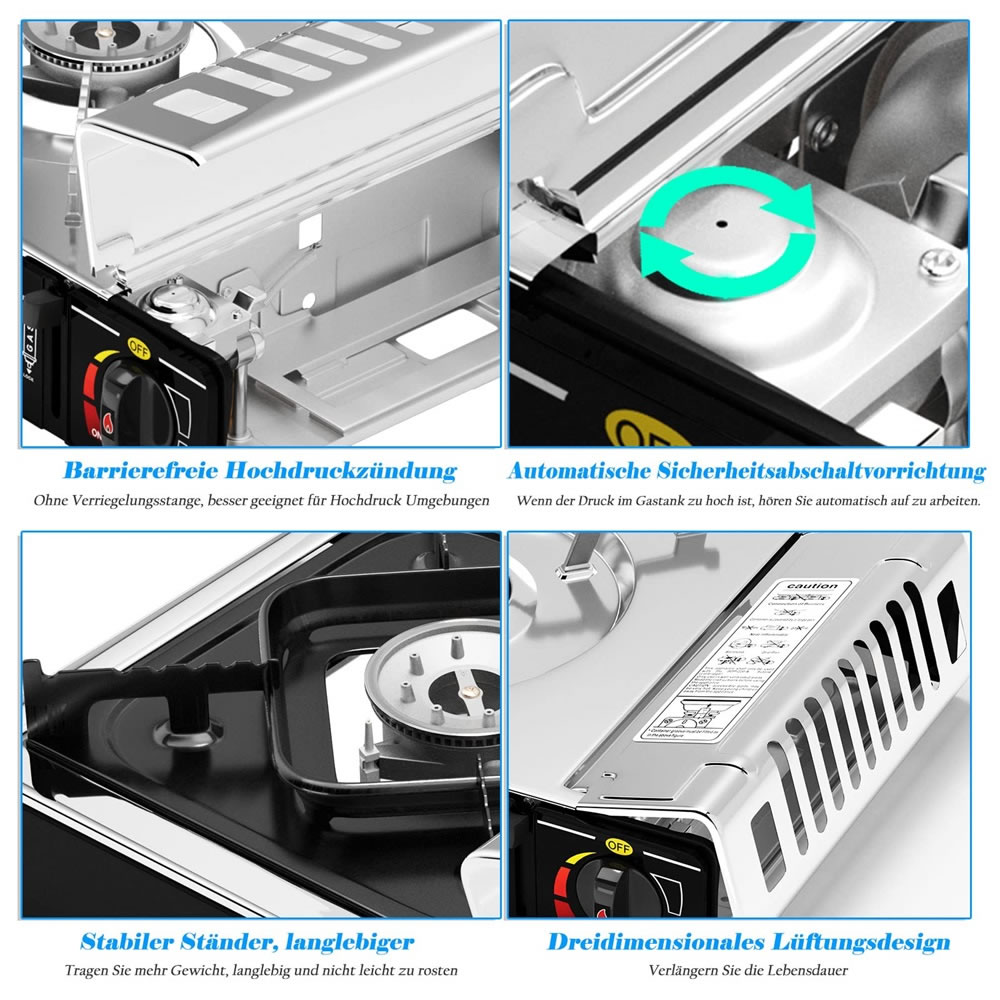 the safe flameout setting has an external sealing system to prevent gas leakage. The windproof design and explosion-proof oven core have good heat dissipation performance and the flame is more stable. Please rest assured to use our product. Piezo ignition design with safety lock for easy use.