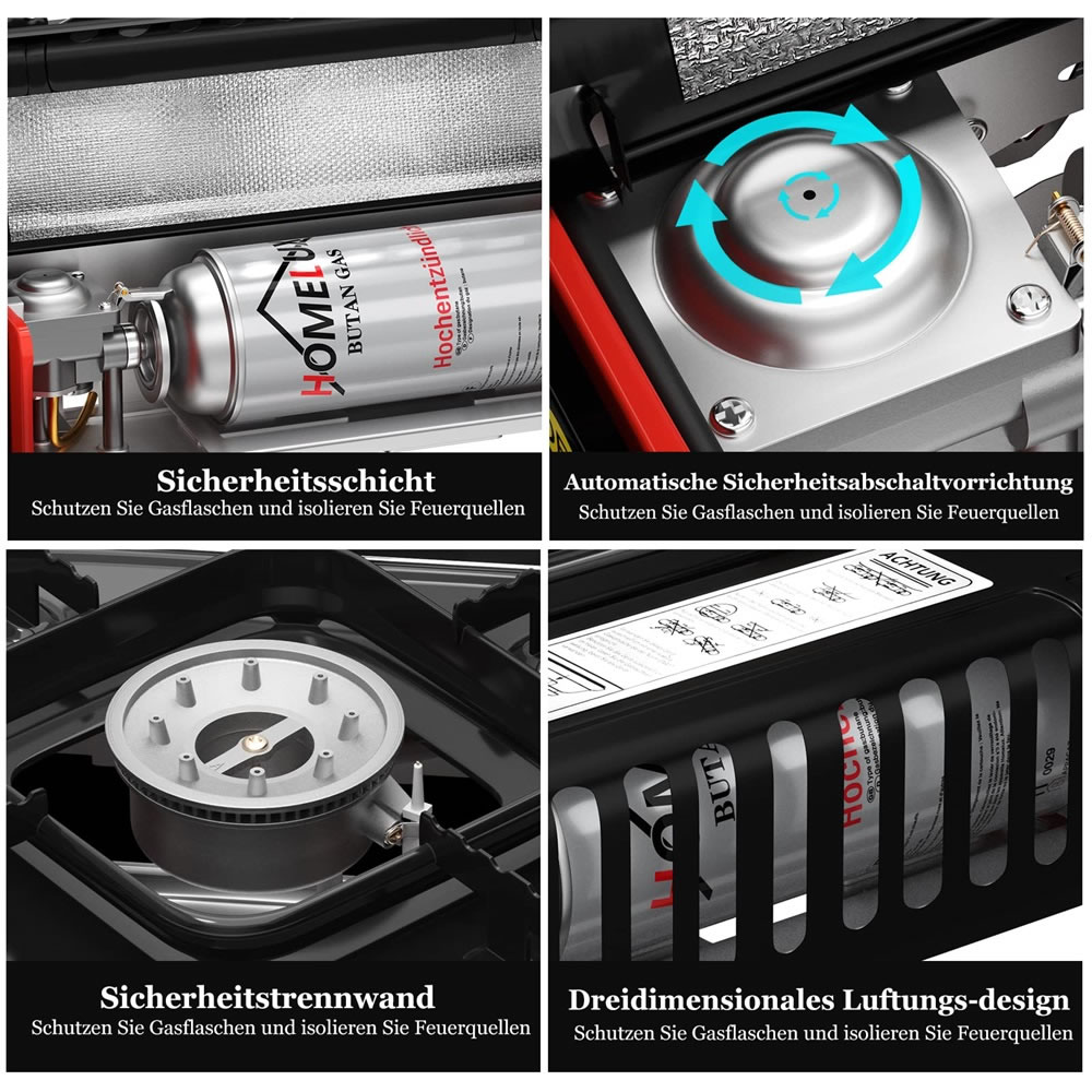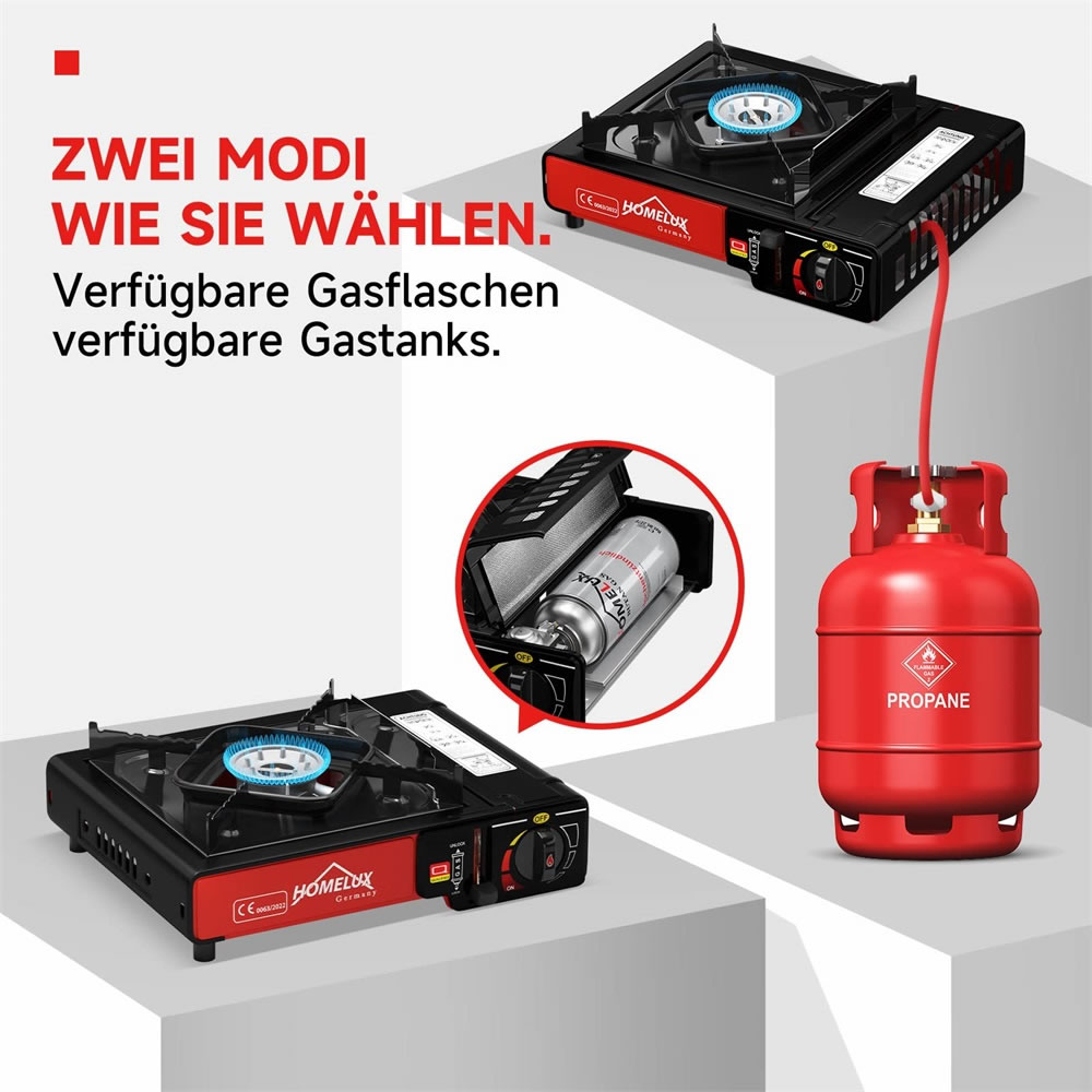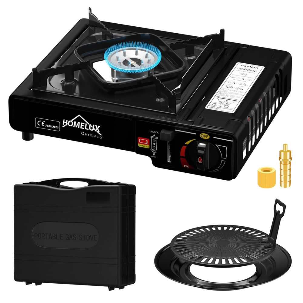 Homelux gas cooker with accessories, compatible with gas stoves and standard gas bottles, versatile possibilities for use at home and outdoors