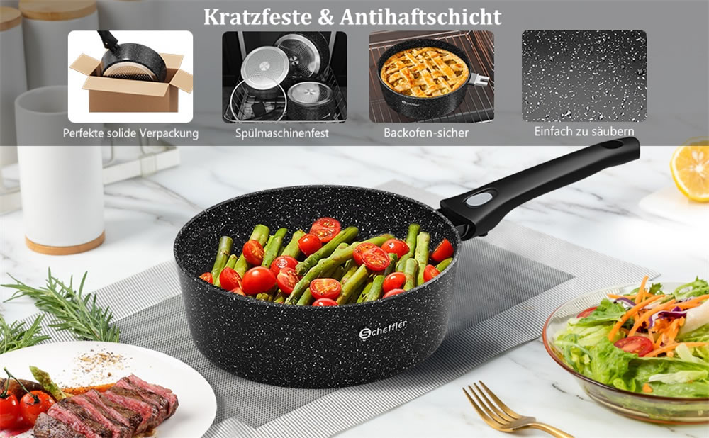 The frying pan with lid preserves the food diet, the 7 cm high side is not only suitable for frying, but also enough for stewing, and the high side effectively prevents food from overflowing. The removable silicone handle can prevent burns and save storage space. If you want to make dessert cakes, simply remove the handle and the glass lid. This is a real multi-purpose pan that will enhance your cooking pleasure.