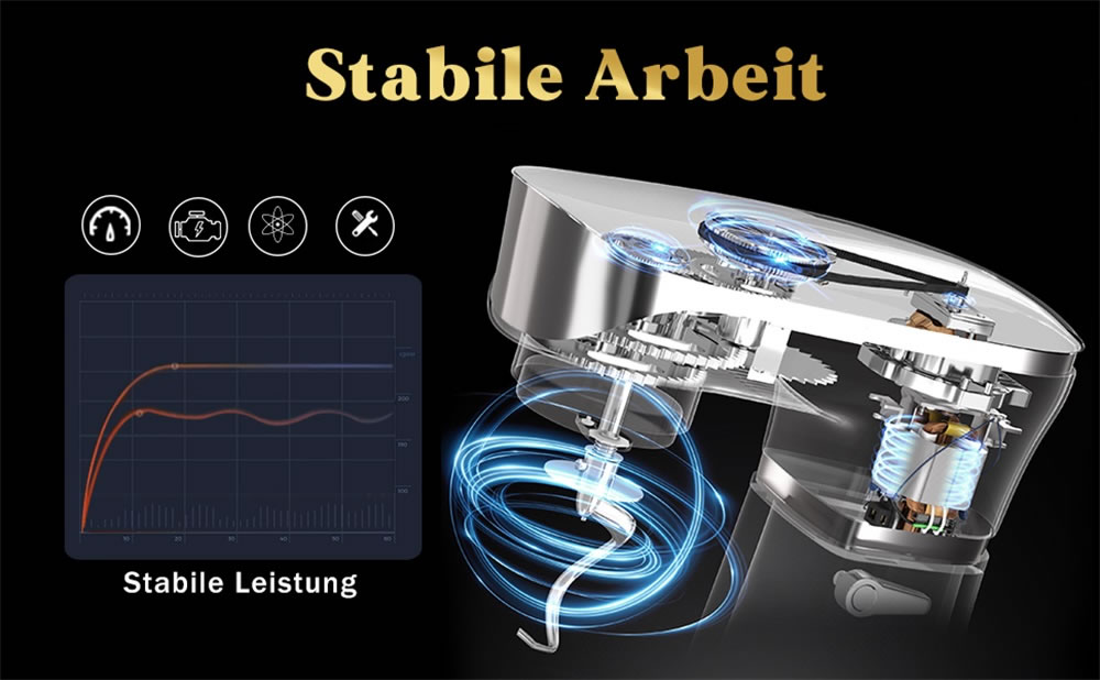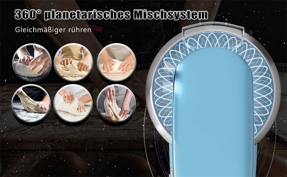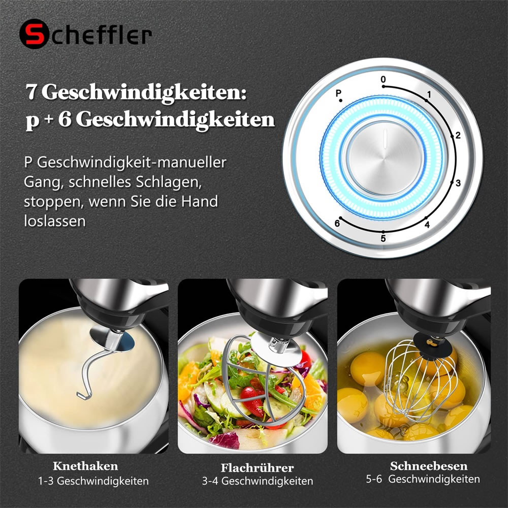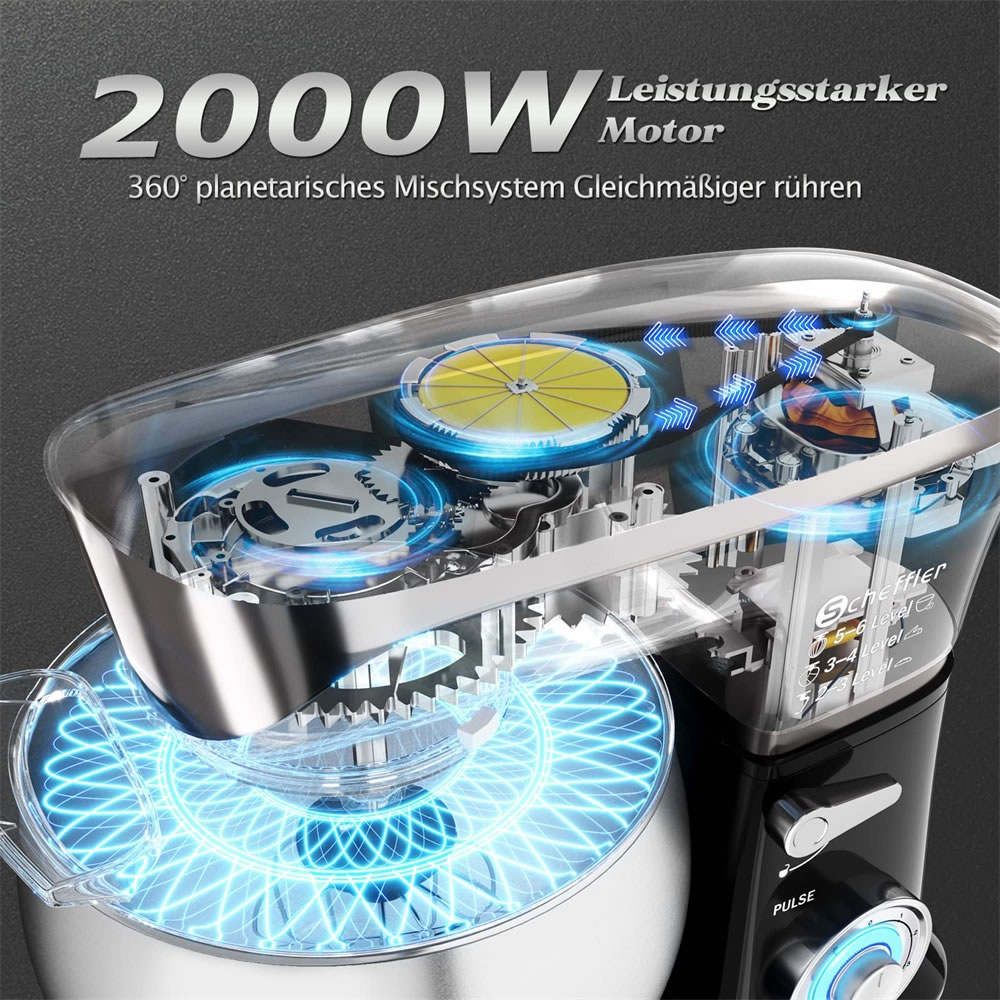 Scheffler food processor with 2000 W high-performance motor made of pure copper and robust ABS housing ensure fast and thorough mixing. 360° planetary mixing system, stir more evenly. The non-slip suction feet on the bottom keep the mixer stable and prevent slipping when working.