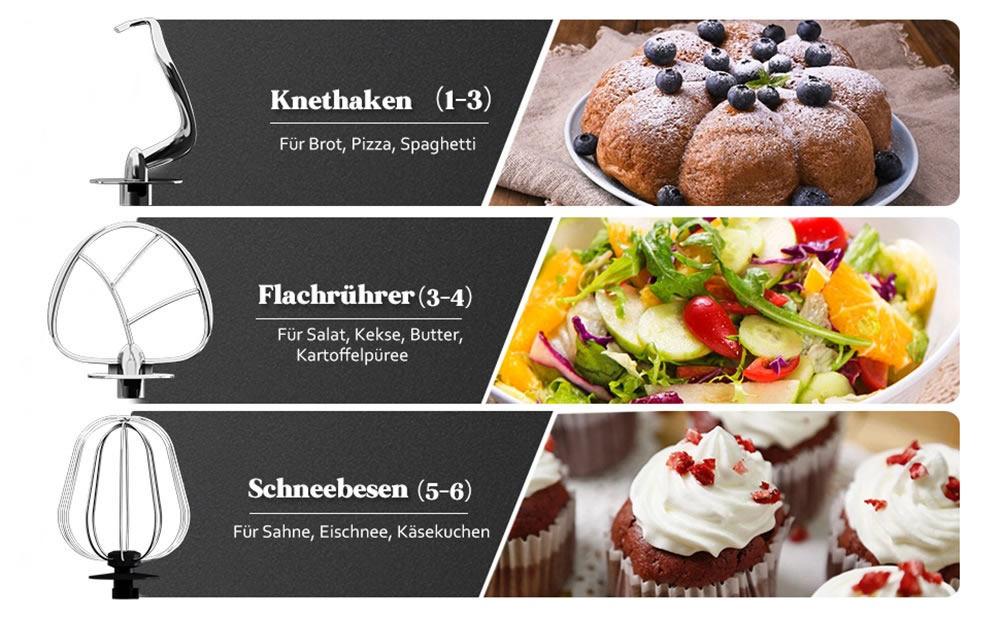 the multifunctional food processor has a dough hook, a mixer and an egg mixer. All accessories are dishwasher safe. You can safely put it in your dishwasher. Package includes: 1 x Scheffler kneading machine (2000 W), 1 x 6L stainless steel bowl, 1 x splash guard, 1 x spatula, 1 x multilingual instruction manual.