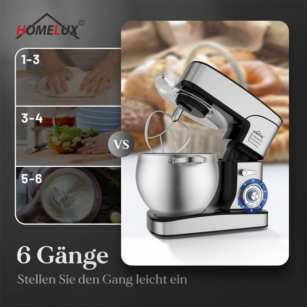 the housing of the Homelux electric stand mixer is made of stainless steel, with good heat dissipation and corrosion resistance, and 80% higher stability than other mixers with ABS housing, ensuring long-lasting use. Built by integrated die-casting process, with a tapered line design and internal high-density structure, makes it more exquisite and stronger load resistance.