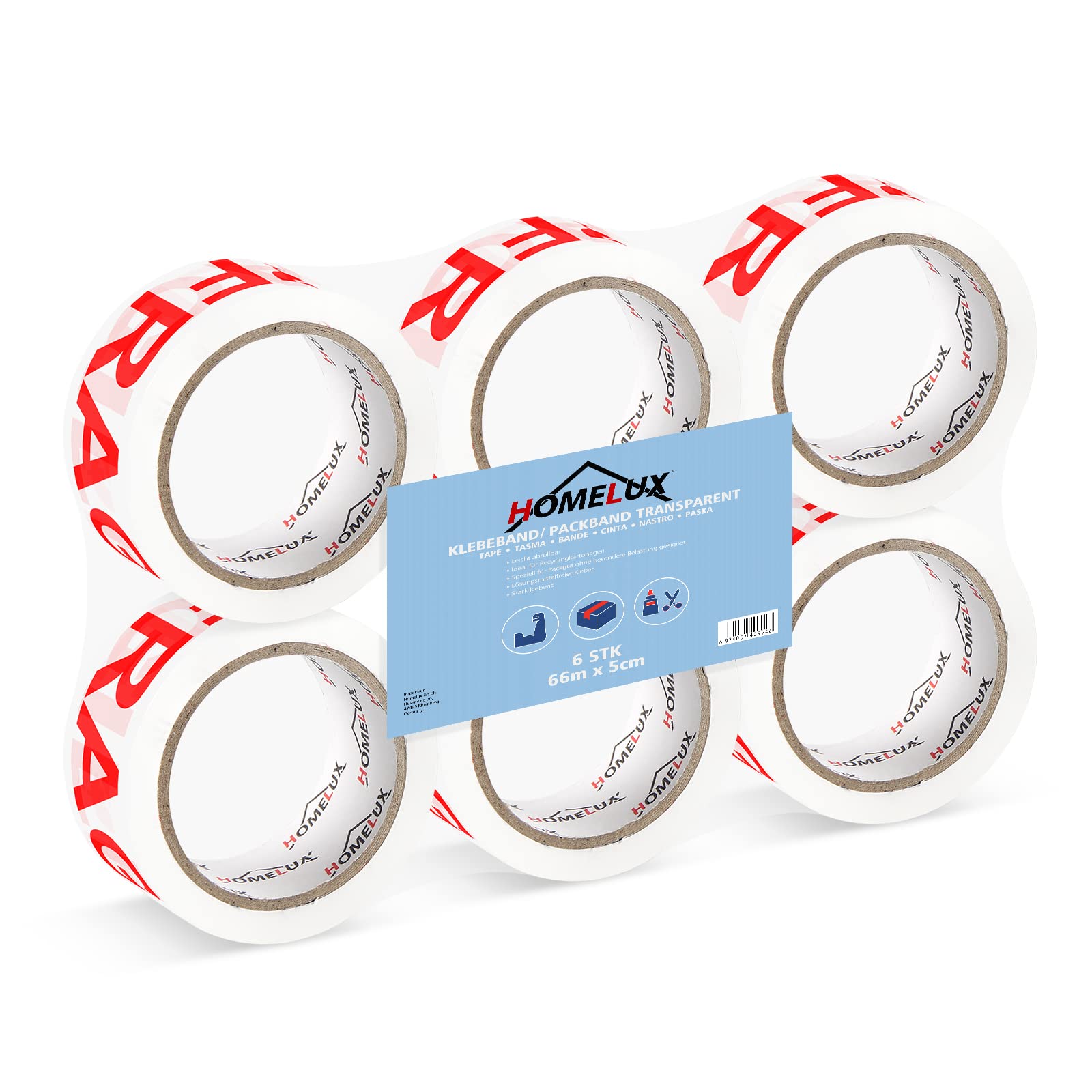 6 rolls. Colour: "Fragile" in red font on a white base. Length: 66 metres. Width: 50 mm