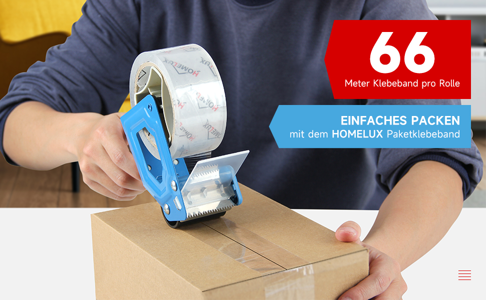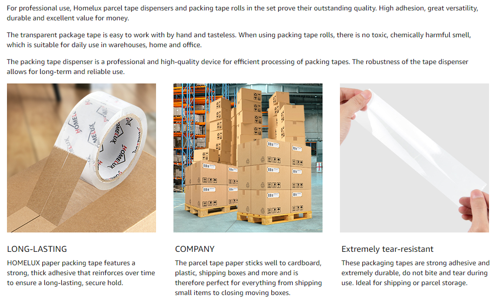 excellent durability and adhesion. With Homelux package tape, safe, simple and strong packaging is possible. They work well in a variety of conditions, whether moving, transporting or storing. Ideal for warehouse, home or office.
