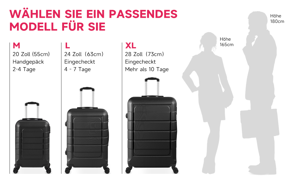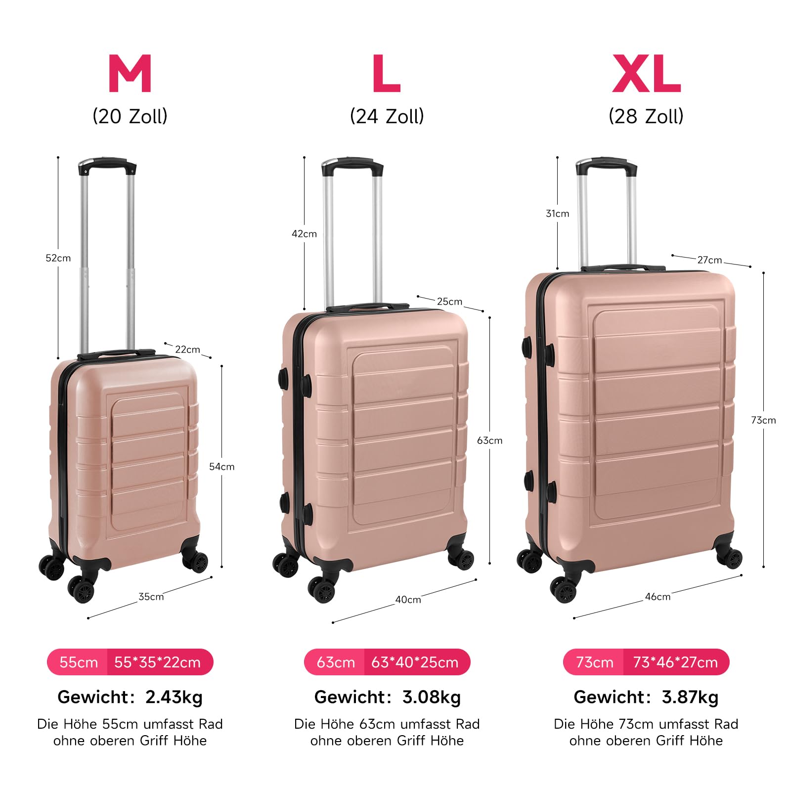 the M suitcase measures approx. 54 x 35 x 22 cm and weighs only 2.43 kg, the L-suitcase is about 63 x 40 x 25 cm in size and weighs 3.08 kg, while the XL case measures 73 x 46 x 27 cm and has a weight of 3.87 kg. Please allow 1-2cm error due to manual measurement.