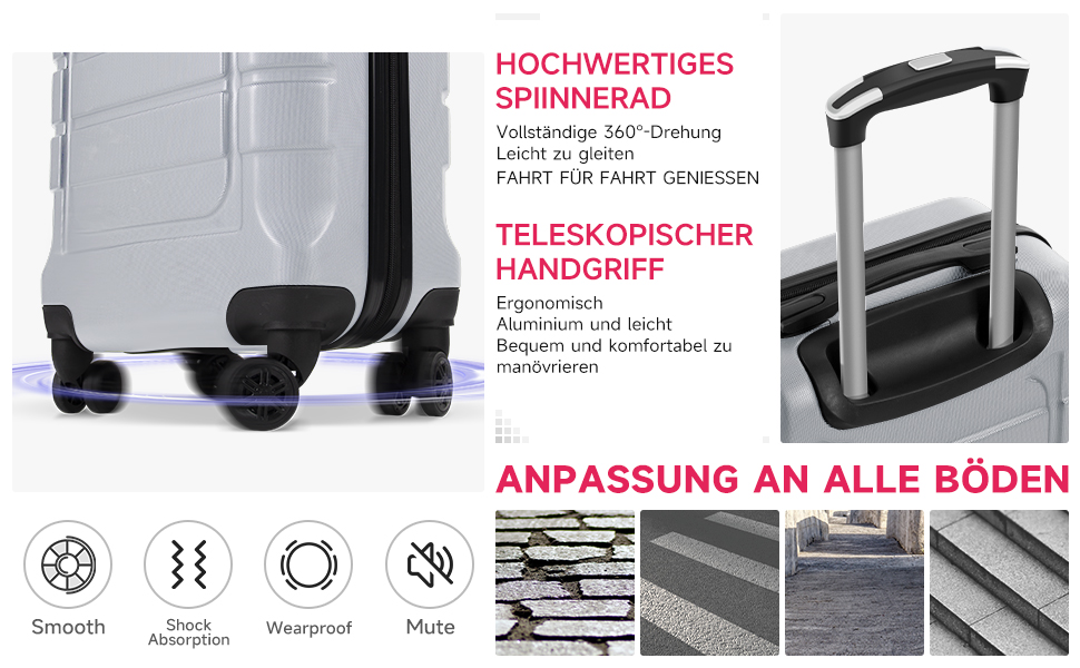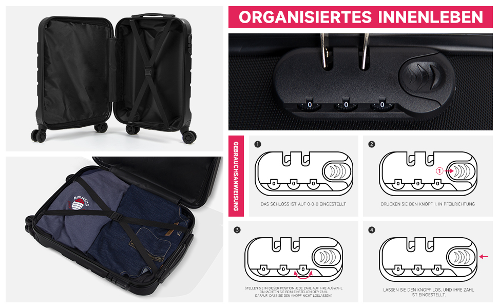 The 4 smooth-running wheels and height-adjustable telescopic handle make transporting suitcases a breeze, no matter how full they are. The integrated 3-dial combination lock ensures the protection of your valuables during travel.