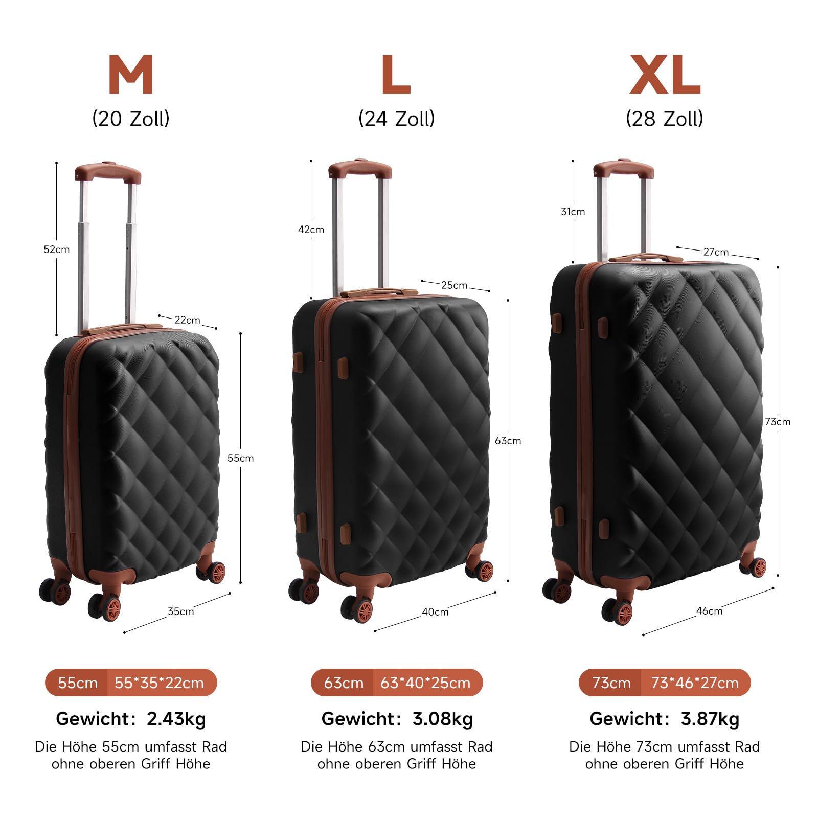 (handle retracted, including wheels and handles): M size suitcase (H x W x D) – 55 x 35 x 22 cm, weight: 2.43 kg; L size suitcase – 63 x 40 x 25 cm, weight: 3.08 kg; XL size suitcase: 73 x 46 x 27 cm, weight: 3.87 kg. (Due to the size of manual measurement, there may be an error of 1-2 cm)