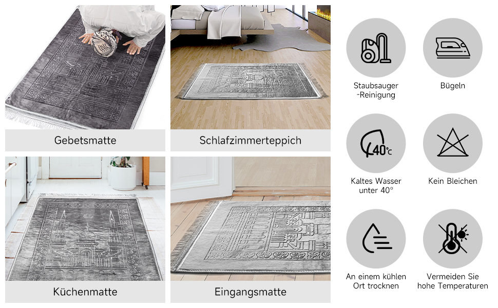 Homelux Islam prayer mat can be cleaned with a vacuum cleaner; machine wash in cold water below 104 °F (approx. 40°C), do not bleach. Hang to dry in the shade. Avoid prolonged soaking and high temperatures. Size: 31.5 inches × 47 inches / 80 x 120 cm.