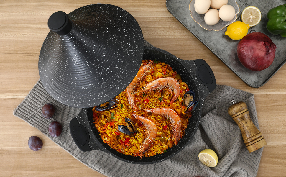 stainless steel composite base and cast aluminium lid make the product much lighter than cast iron or ceramic tagines and keeps the heat longer. The non-stick coating of the tagine pot makes cooking and cleaning easier.