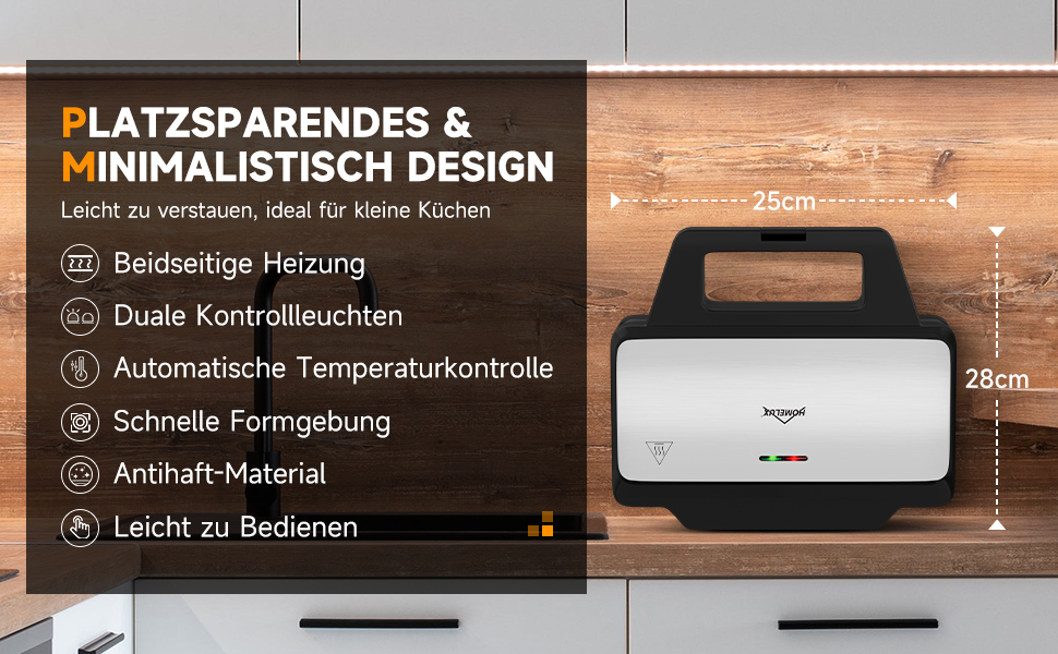 Our waffle iron is equipped with heat-resistant handles, non-slip feet, magic latches to lock the heating plates on both sides and a lockable lid - a safe configuration that gives you and your children more security, ideal for school parties and children's birthday parties. Lightweight and space-saving, it can be used in small spaces or stored horizontally or upright in cupboards.