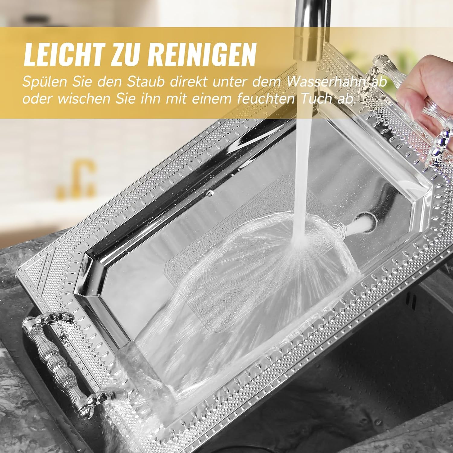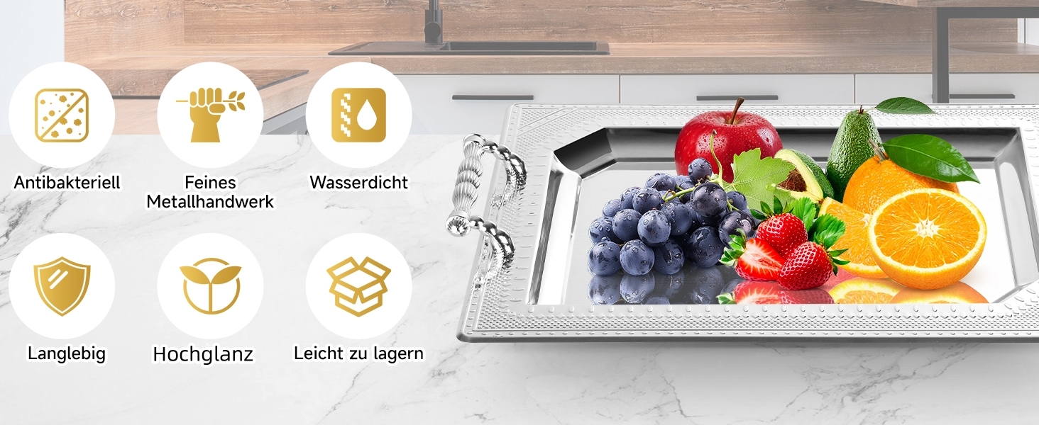 Tray Set: Two sizes of trays that can meet different daily use requirements. Size: 46x35cm & 36x26cm tray set. Practical tray: This charming tray is suitable for use in any scene. Not only can it be placed in the living room, dining room or bedroom, but it can also be used as a bathroom tray or serving tray. This beautiful tray will definitely not disappoint. Decorative tray: This charming tray has timeless beauty and elegant visual effects, suitable for use in any scene. You can also realize many Christmas decoration ideas, such as Christmas bowl decoration, where you can fully display your design power. Excellent material. Stainless steel metal material is not only sturdy and durable, but also lightweight. The surface coating is fine, and the edges are smooth but not sharp. Exquisite craftsmanship and high-gloss trays can easily become highlights in the scene. Homelux Decorative Tray Set | Versatile | High quality materials | Exquisite craftsmanship | Can be used as decorative tray & serving platter & candle tray.