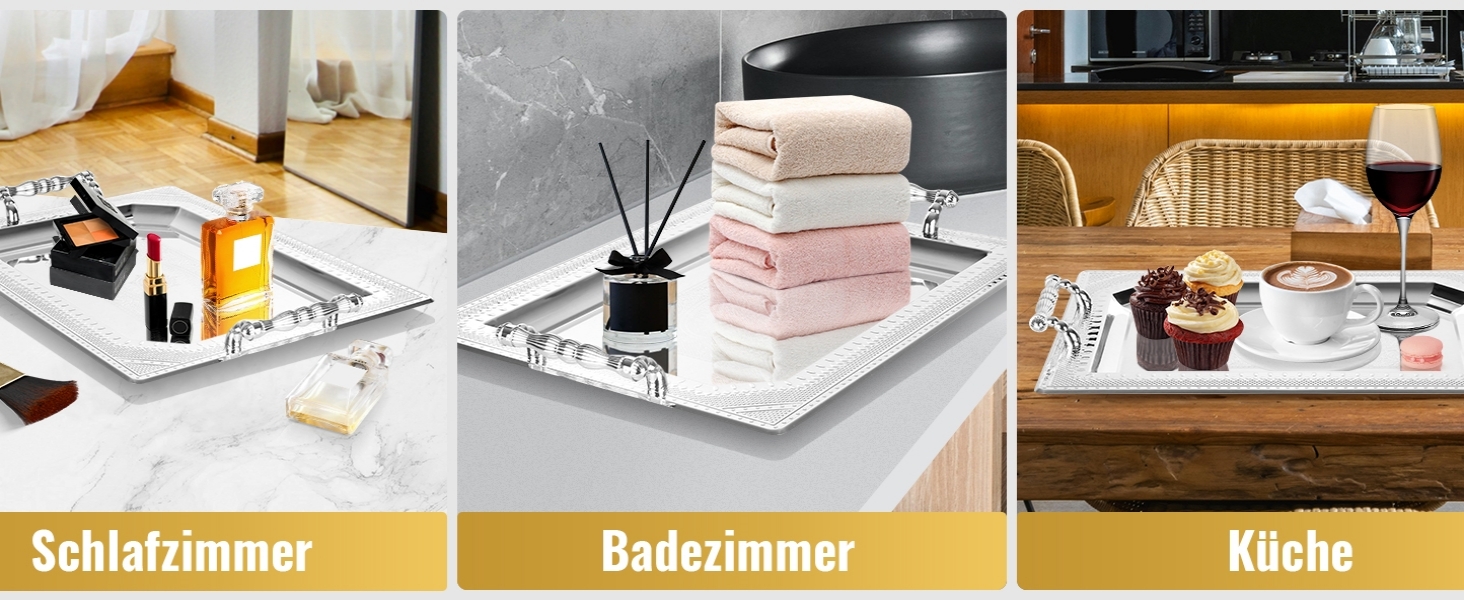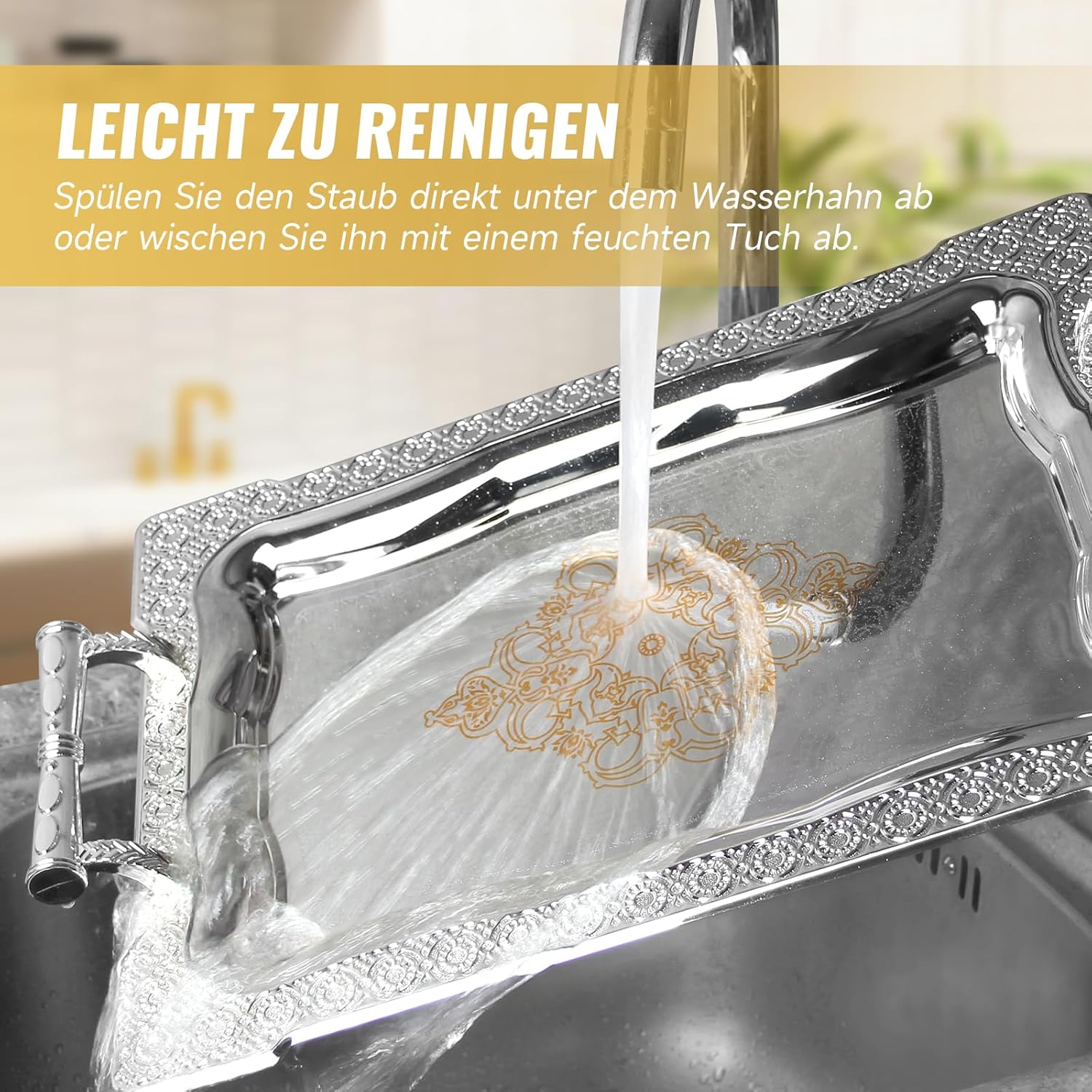 Tray Set: Two sizes of trays that can meet different daily use requirements. Size: 46x35cm & 36x26cm tray set. Practical tray: This charming tray is suitable for use in any scene. Not only can it be placed in the living room, dining room or bedroom, but it can also be used as a bathroom tray or serving tray. This beautiful tray will definitely not disappoint. Decorative tray: This charming tray has timeless beauty and elegant visual effects, suitable for use in any scene. You can also realize many Christmas decoration ideas, such as Christmas bowl decoration, where you can fully display your design power. Excellent material. Stainless steel metal material is not only sturdy and durable, but also lightweight. The surface coating is fine, and the edges are smooth but not sharp. Exquisite craftsmanship and high-gloss trays can easily become highlights in the scene. Homelux Decorative Tray Set | Versatile | High quality materials | Exquisite craftsmanship | Can be used as decorative tray & serving platter & candle tray.