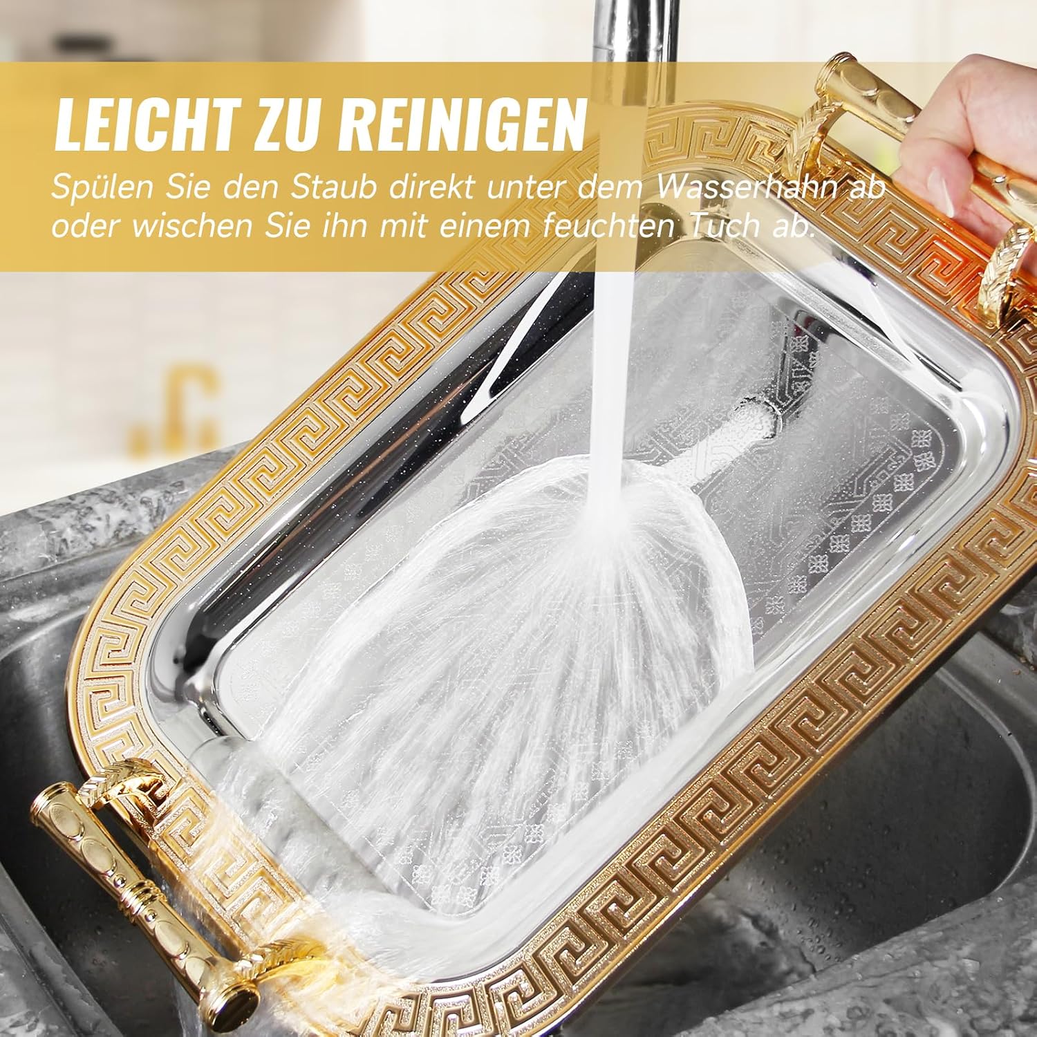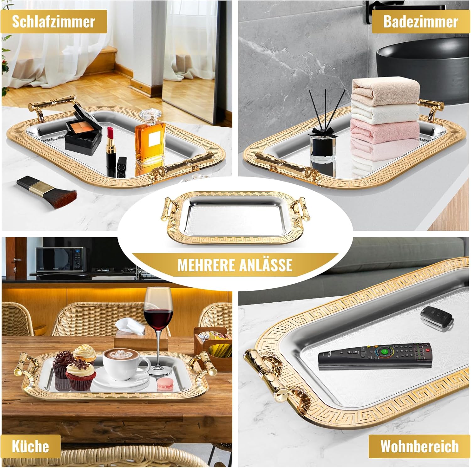 Tray Set: Two sizes of trays that can meet different daily use requirements. Size: 46x35cm & 36x26cm tray set. Practical tray: This charming tray is suitable for use in any scene. Not only can it be placed in the living room, dining room or bedroom, but it can also be used as a bathroom tray or serving tray. This beautiful tray will definitely not disappoint. Decorative tray: This charming tray has timeless beauty and elegant visual effects, suitable for use in any scene. You can also realize many Christmas decoration ideas, such as Christmas bowl decoration, where you can fully display your design power. Excellent material. Stainless steel metal material is not only sturdy and durable, but also lightweight. The surface coating is fine, and the edges are smooth but not sharp. Exquisite craftsmanship and high-gloss trays can easily become highlights in the scene. Homelux Decorative Tray Set | Versatile | High quality materials | Exquisite craftsmanship | Can be used as decorative tray & serving platter & candle tray.