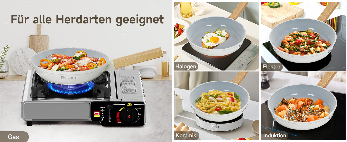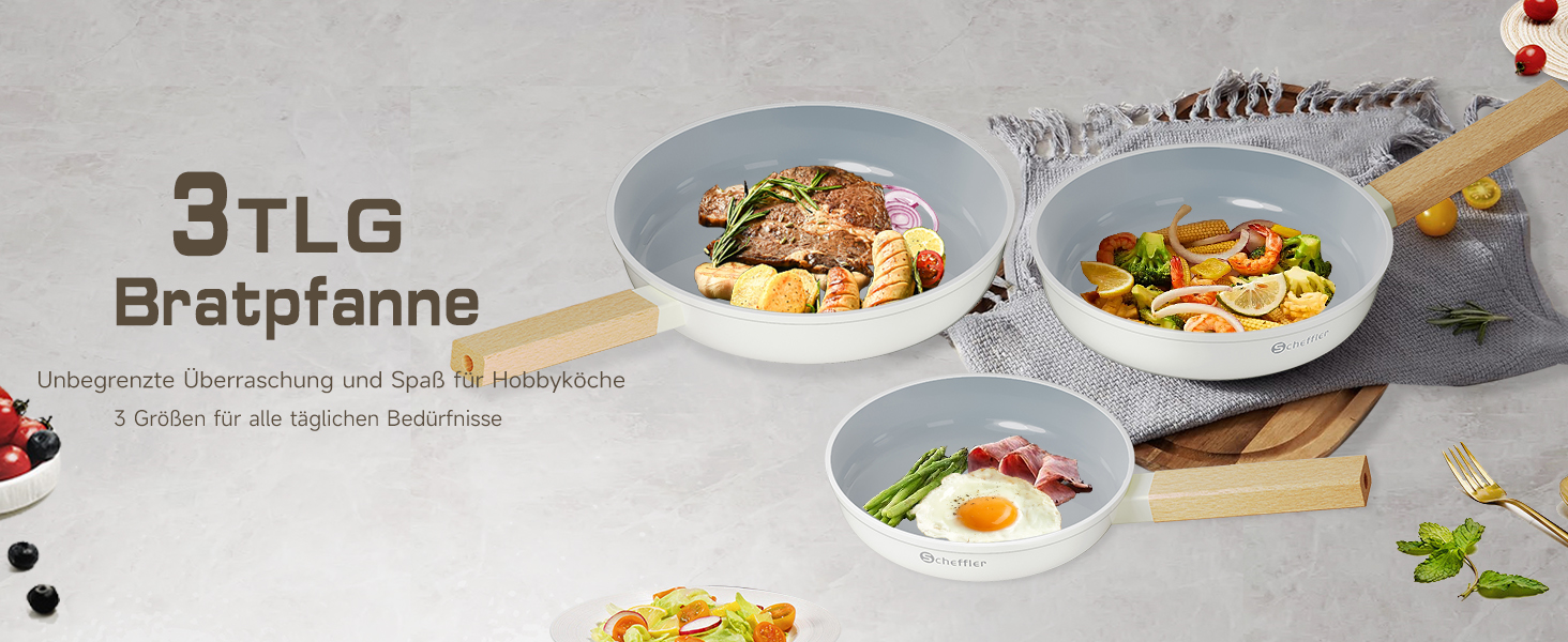 SAFE MATERIAL HEALTHY COOKING - Double layer ceramic non-stick coating is 100% free of PTFE, PFOA, PFOS and PFAS. No harmful chemicals for healthy food preparation. Versatile use on all hobs - Thanks to the aluminium alloy induction base, the pans are suitable for all types of cookers: induction, gas, electric, ceramic and halogen. Perfect for any kitchen! Fast heating & energy-saving - The robust aluminium body conducts heat quickly and evenly, so that food is optimally cooked with low energy consumption. Perfect for low-fat frying and crispy results on meat, fish or vegetables. EASY CLEANING & EASY CARE - Smooth ceramic coating allows for effortless cleaning - simply wipe clean with a soft sponge. Not dishwasher safe and not oven safe (due to wooden handle), avoid hard kitchen utensils so as not to damage the coating. Box contents & sizes: 3-piece pan set consisting of frying pan with diameter 20/24/28 cm. Aluminium pan with double layer ceramic non-stick coating and energy-saving induction base - ideal for everyday use! White-grey design with wooden handle for a stylish, a kitchen for you!