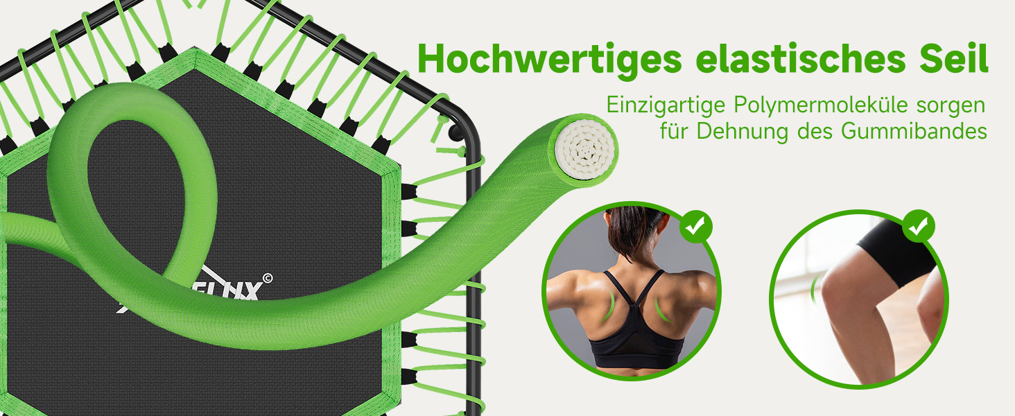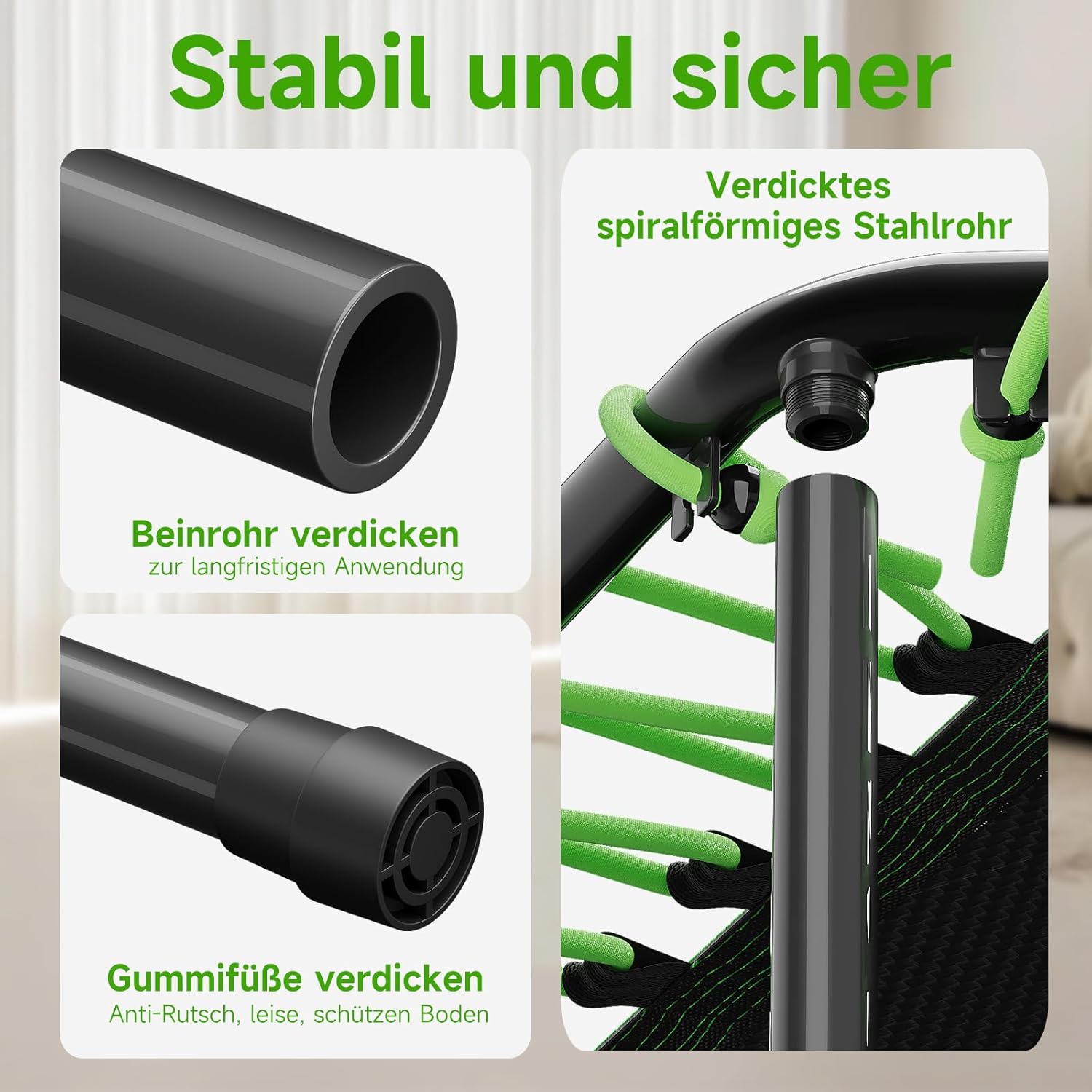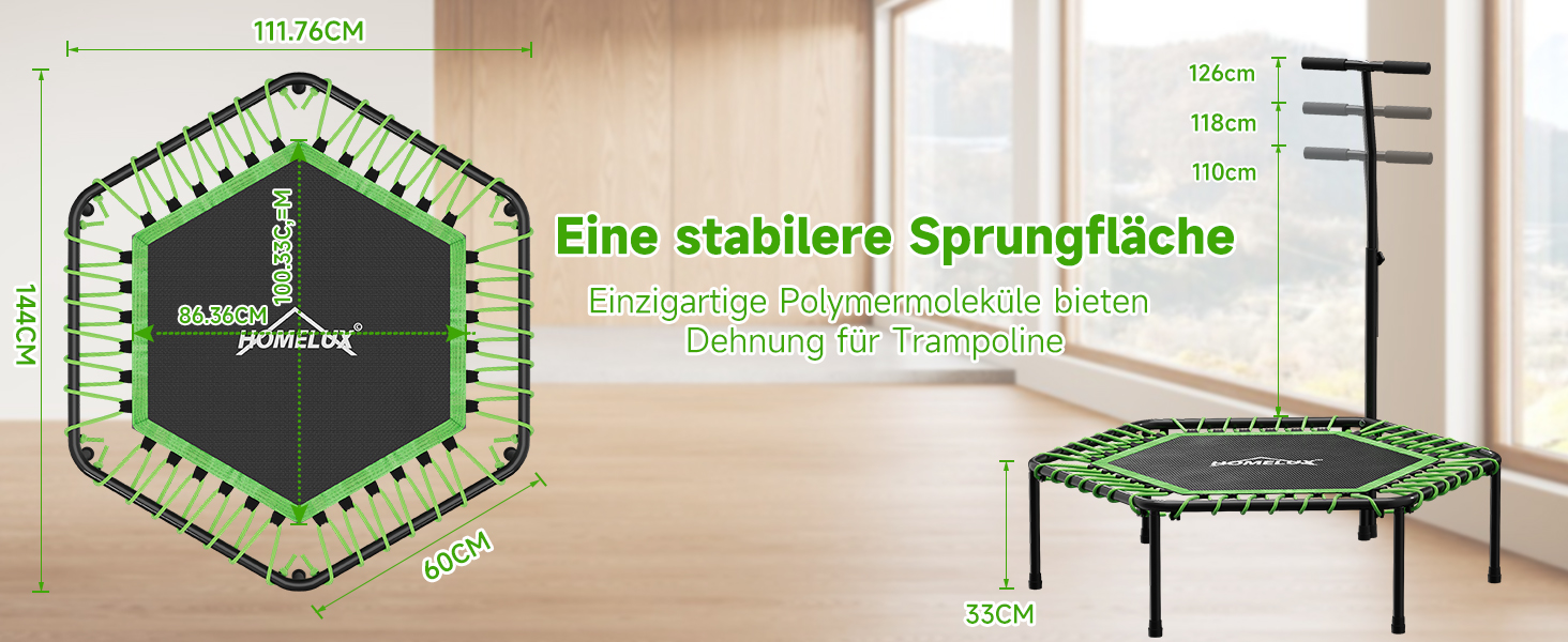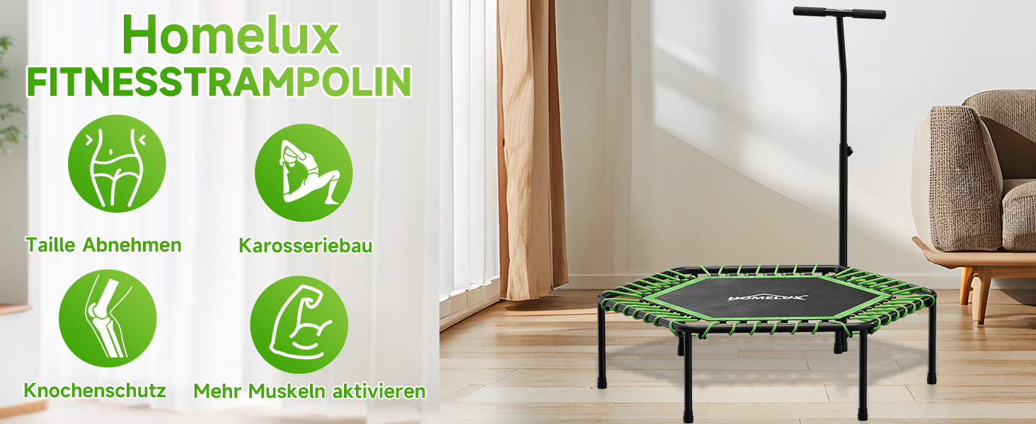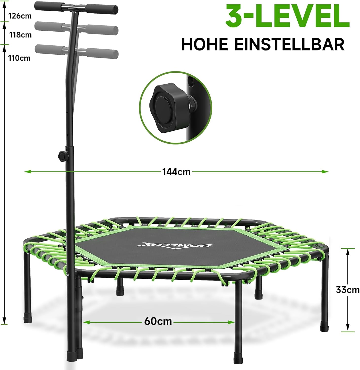 3-Level Adjustable Handle: The fitness trampoline for adults is equipped with a height-adjustable T-handle with a range of 110 cm to 126 cm. You can find the most comfortable position for your individual needs to optimise your training and improve your overall performance. The design of the T-handle ensures a firm grip and increased safety. Weight capacity of 220 lb: HOMELUX trampoline rebound is made of thickened steel frame for a robust construction. The high-quality PP jumping mat is very wear-resistant and tear-resistant. Durable M8 elastic cords form a complete and powerful elastic system, Superior Bounce System: Equipped with 8 mm thick rubber cords, the high elasticity coefficient and stable resistance can dampen most vibrations, thus providing intimate protection for knees, joints and back. Compared to spring trampolines, rubber rope trampolines offer you a quiet, safe and comfortable training experience. Enjoy a gentle, gentle and effortless jump training at any time of day. Easy to assemble: this hexagonal indoor trampoline comes in disassembled form, including rubber cords, steel tubes and other necessary installation tools. Equipped with illustrated assembly instructions, it is recommended that 2 people work together, the assembly process becomes simple and efficient, it only takes 15 to 20 minutes to unfold and use the trampoline. Trampoline for the home: the mini trampoline has a jumping surface with a diameter of 144 cm, which offers plenty of space for a free and varied training. Jumping for fitness is good for burning calories, relieving stress, improving sleep quality, building strength, promoting balance and improving fitness and blood circulation. Make trampoline jumping a habit and part of your life: