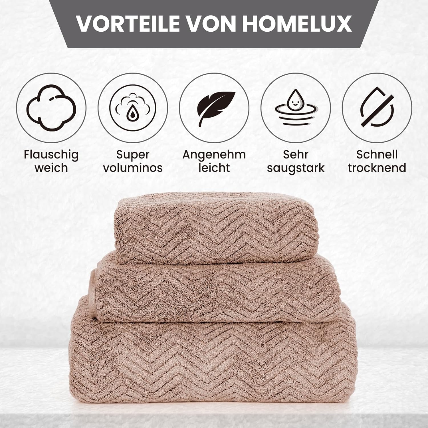 Modern look: terry towel in luxurious, a real eye-catcher for any bathroom, in the gym, swimming pool or on the beach, available in sizes: guest towel 35 x 75 cm, hand towel 50 x 90 cm, bath towel 70 x 140 cm. Premium HOMELUX hand towels: the modern terry bath textiles are made from 80% polyester + 20% polyamide with a Soft and durable: absorbent with non-slip surface, suitable for daily washing, lint-free, dimensionally stable and quick-drying. Versatile - The terry towel is maximum absorbent and is therefore perfect for use at the pool, bathroom, beach, hairdressing salon, spa or gym. The set meets your basic needs when drying in the bathroom. Practical handling: all sizes are equipped with matching cord hangers - the modern border on the sides supports dimensional stability.