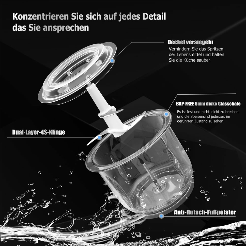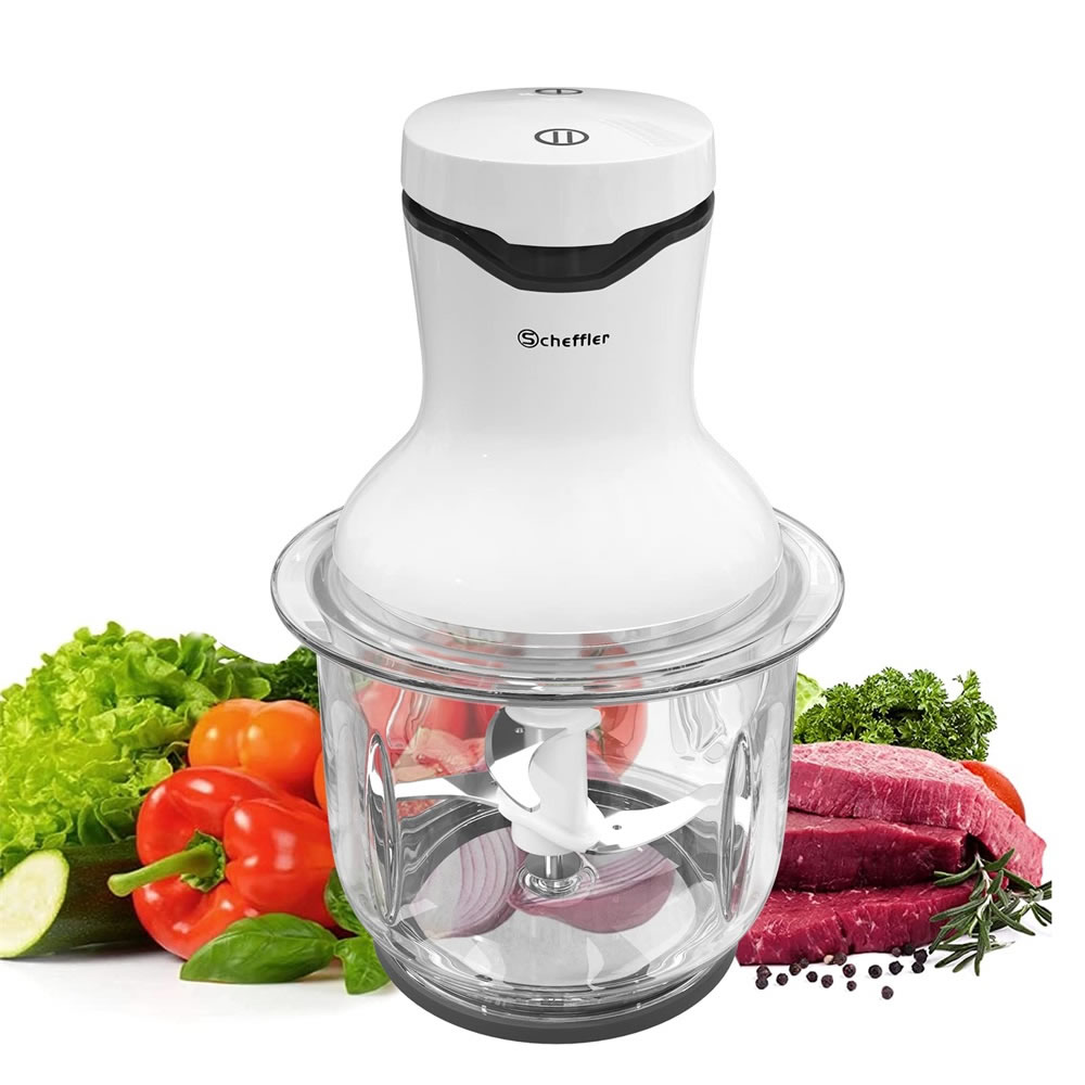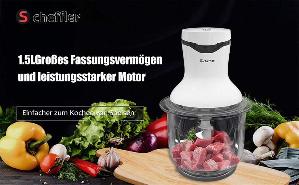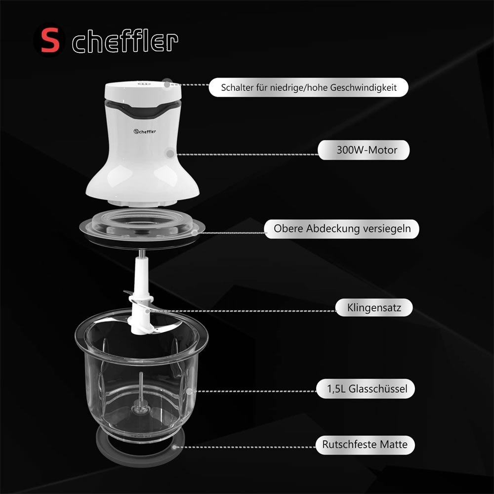 Scheffler electric multi-chopper with 300 W powerful motor, is equipped with a 1.5 L glass container. BPA free, durable, shockproof and durable.