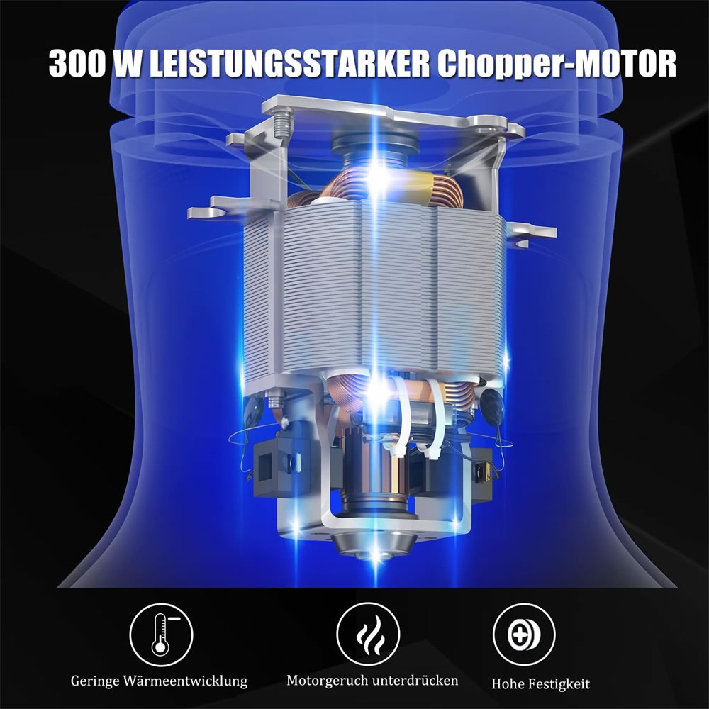 electric multi-chopper with 4 robust food-safe 304 stainless steel blades allow you to chop almost all types of food quickly and effortlessly through upper and lower blades. No more tedious chopping necessary