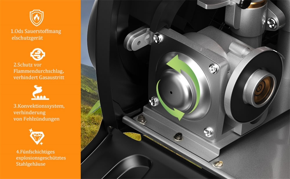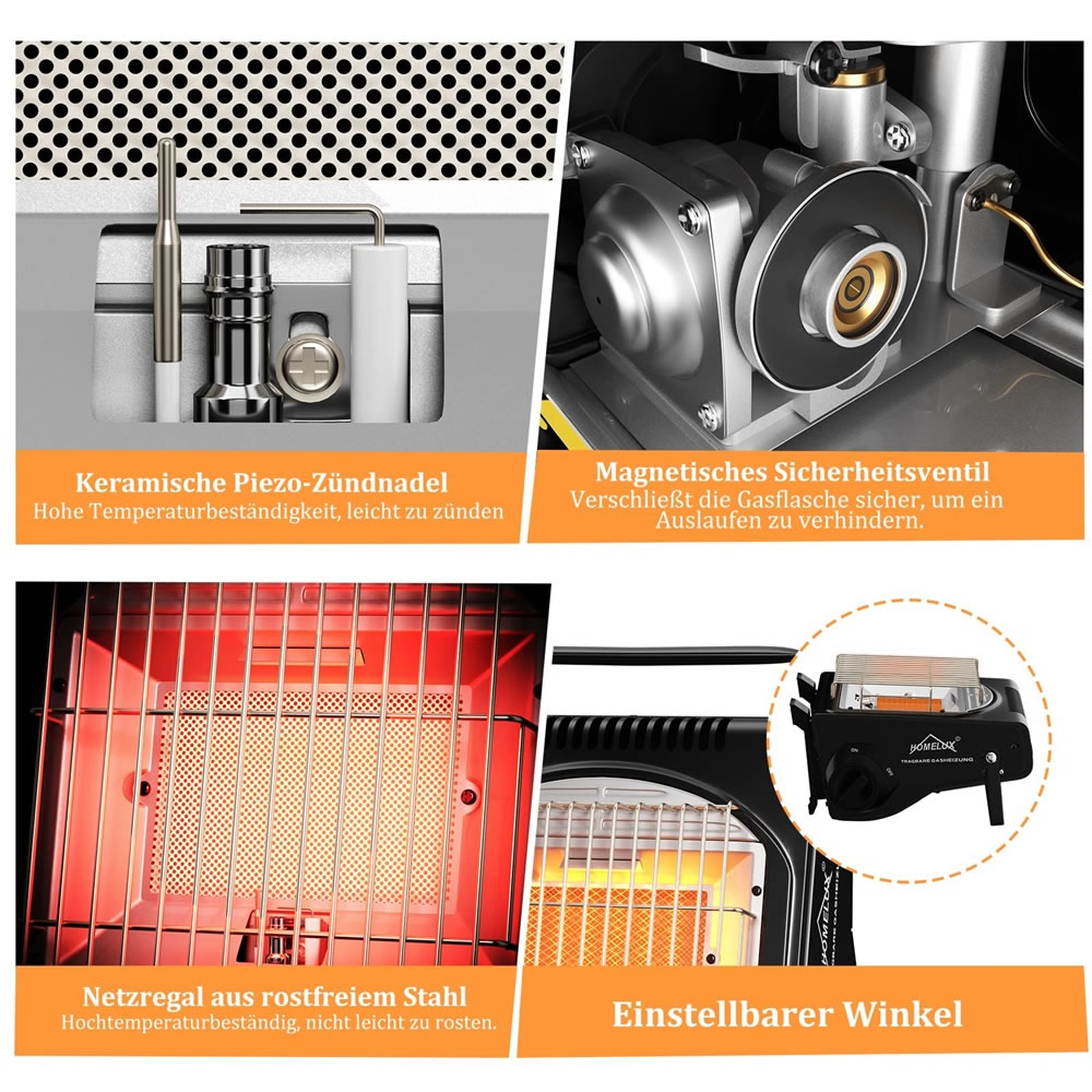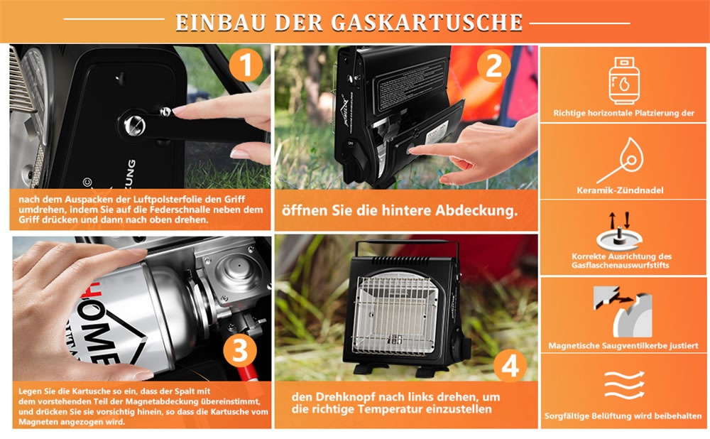 simply insert the cartridge and the camping gas heater is ready to use. The ceramic ignition pin is matched with the brass ignition tube for quick ignition. The heat can be easily adjusted via the button. Stainless steel protective grille ensures safety. The magnetic safety iron suction valve absorbs the ink cartridge more firmly and is more sensitive. The energy-collecting combustion plate heats fast.