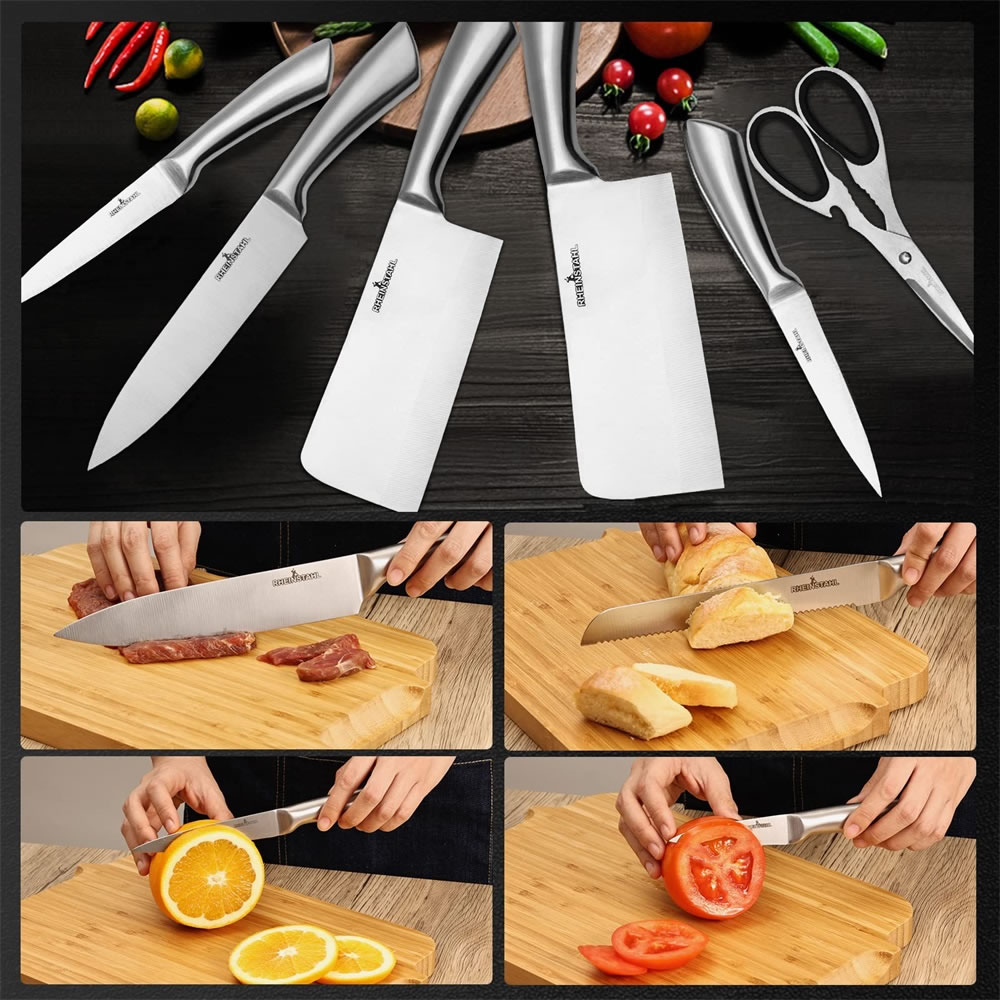 This knife set includes all common kitchen knife sets, 1 bread knife, 1 chef's knife, 1 butcher hatchet, 1 straight boning knife, 1 vegetable knife, 1 oval sharpening steel, 1 general purpose household scissors, 1 knife bag. The curvature of the blade is soft, which is helpful for precise cutting. Different knives meet different cooking needs and prevent the taste of the cord.