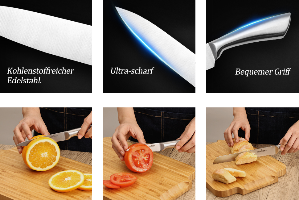 These knives are made of high-carbon stainless steel and feature razor-sharp blades to do a specific task without a problem. The stainless steel provides high durability, longevity and remarkable resistance to chips and corrosion. In addition, this chef's knife set is precision balanced with comfortable, ergonomically shaped handles and offers unparalleled control when chopping and filleting.