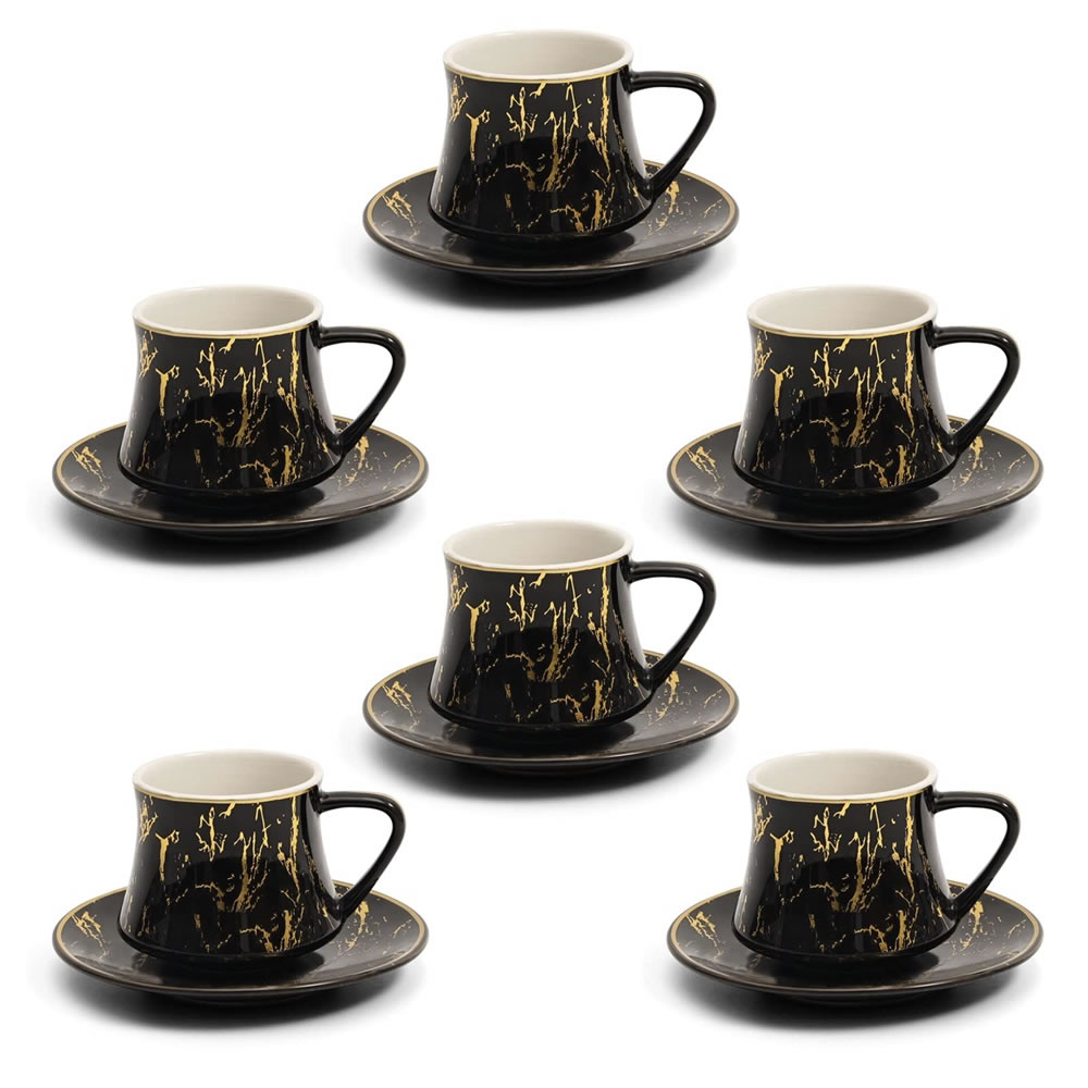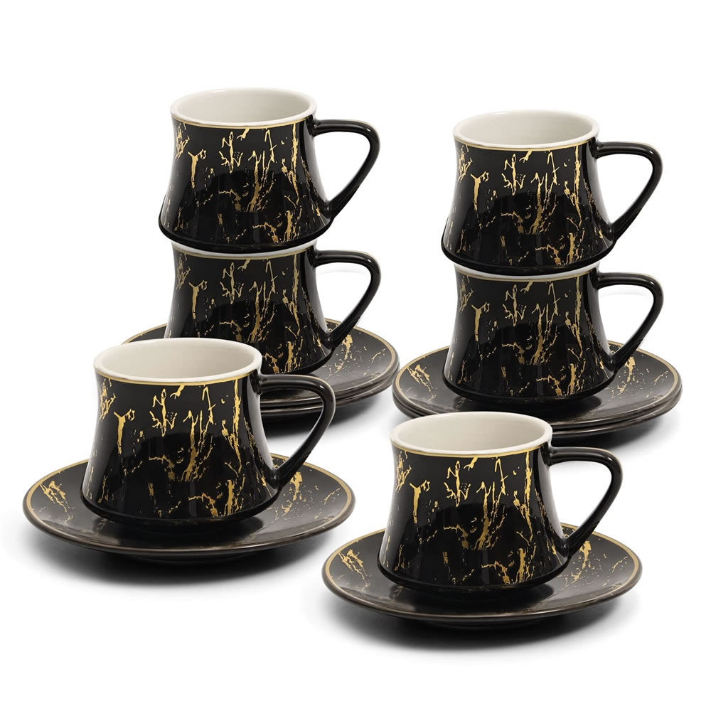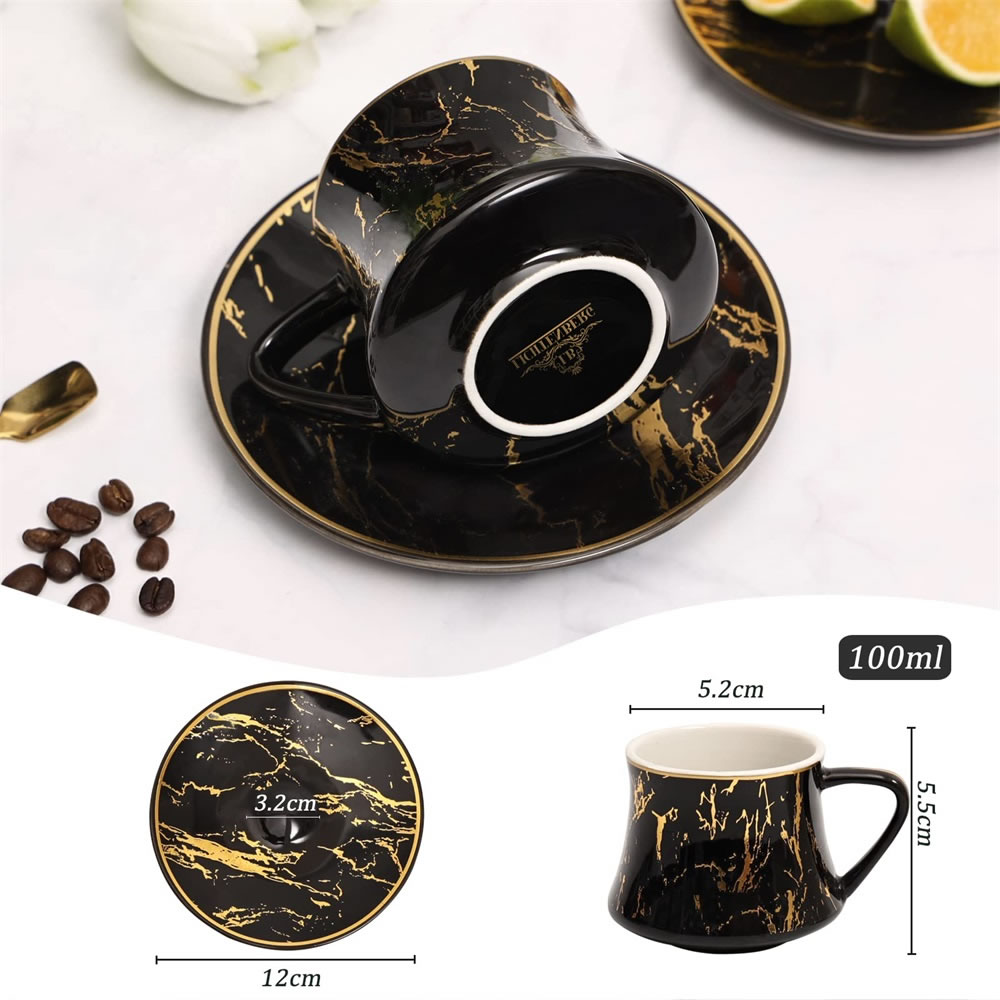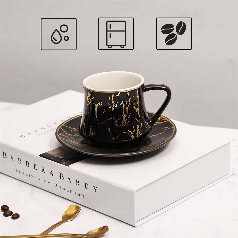 LB LB1186SMB Porcelain Espresso Cups, 100 ml Marble Coffee Cups with Saucer, Large Espresso Set, Black,LB1186SMB