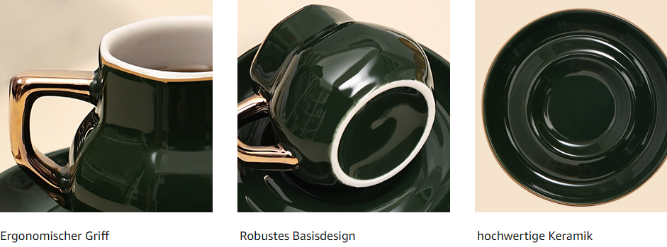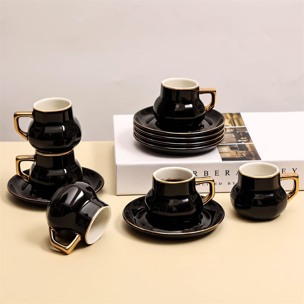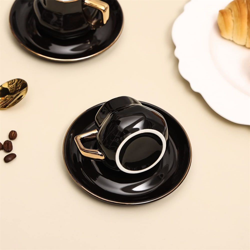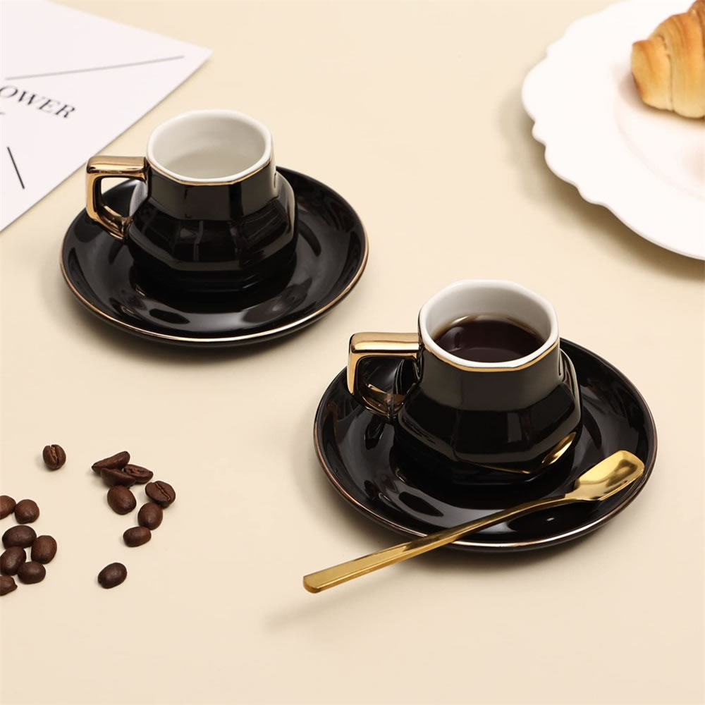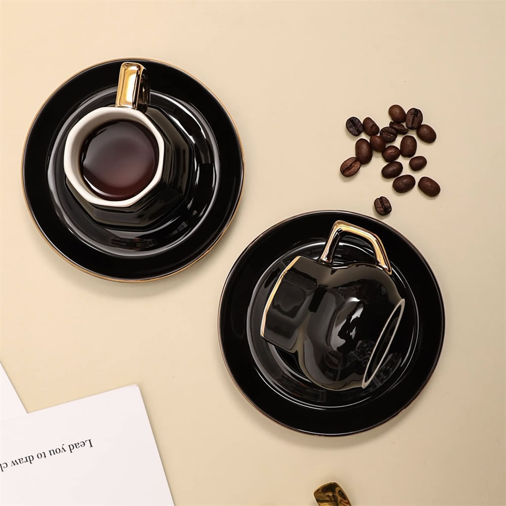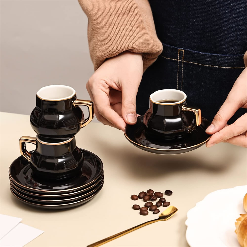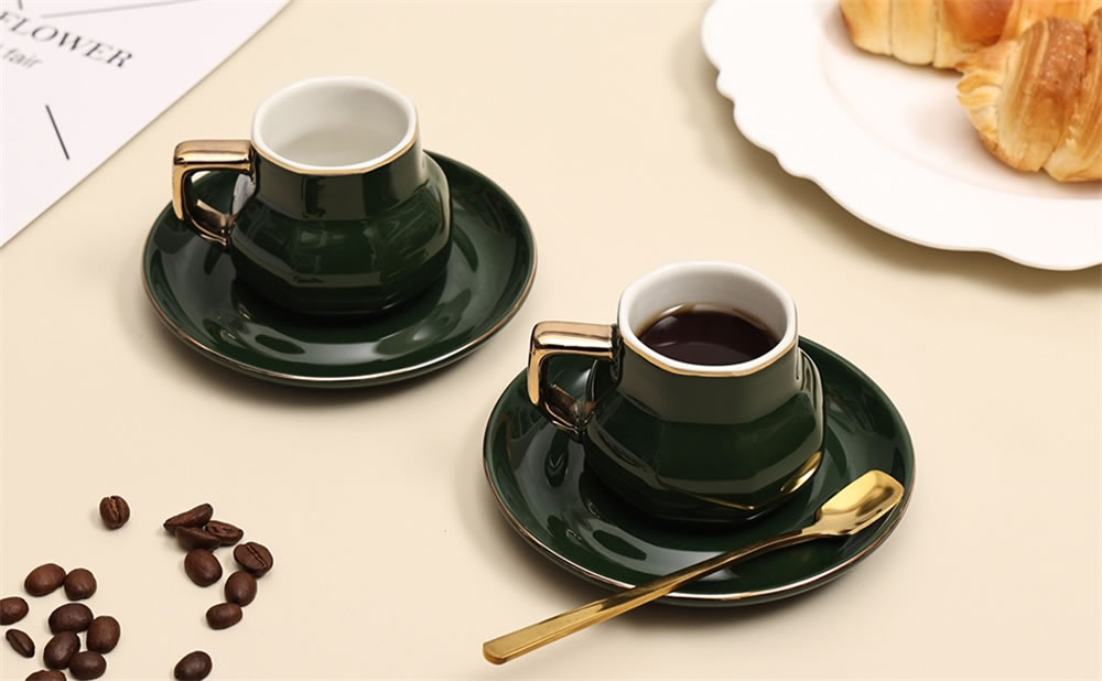 The coffee cup and saucer set is beautiful and generous, and it looks very textured. The espresso cups and saucers are made from strong and durable materials made from professional lead-free ceramic. The glaze is free from harmful substances such as lead and cadmium. Safe in microwave and freezer as well as dishwasher safe.