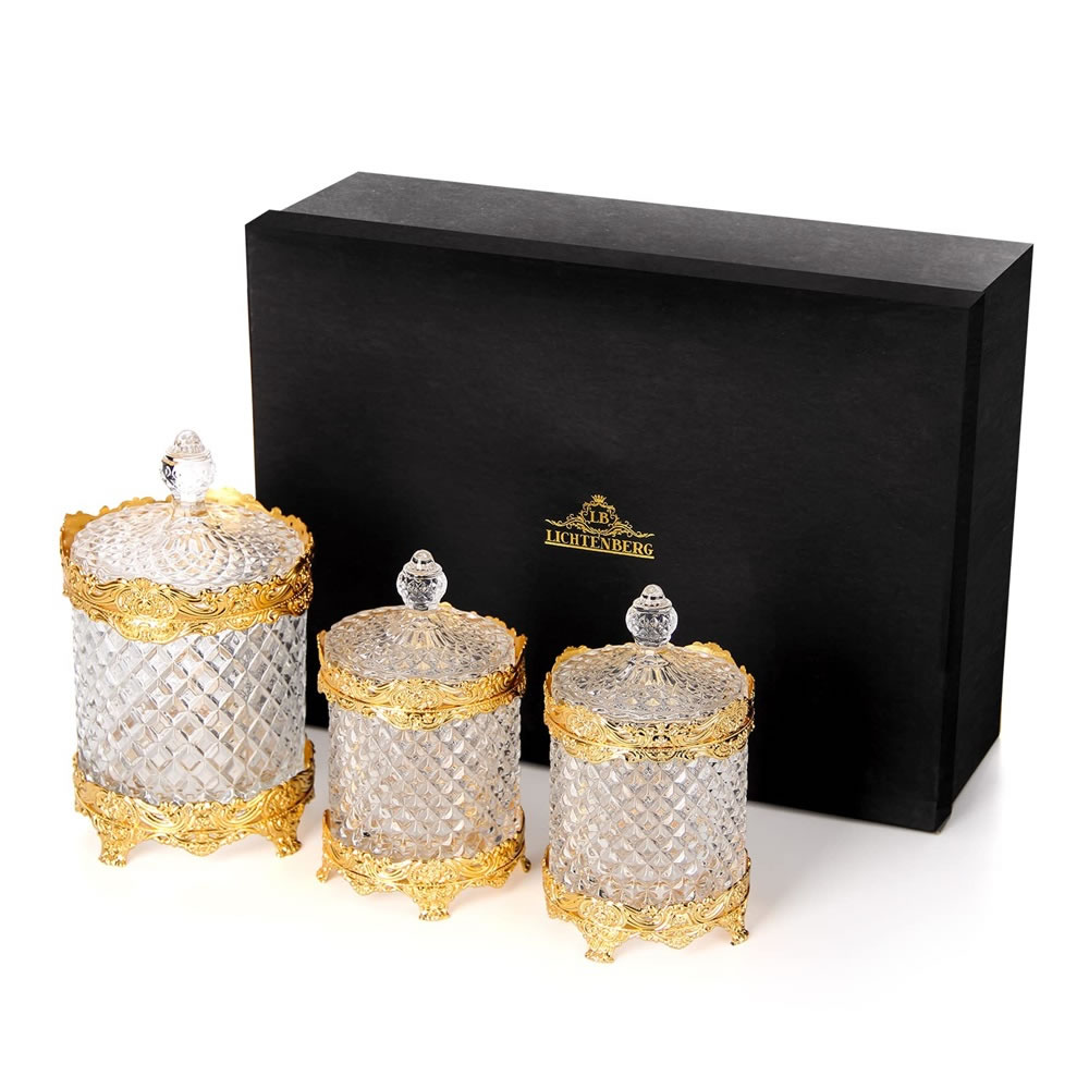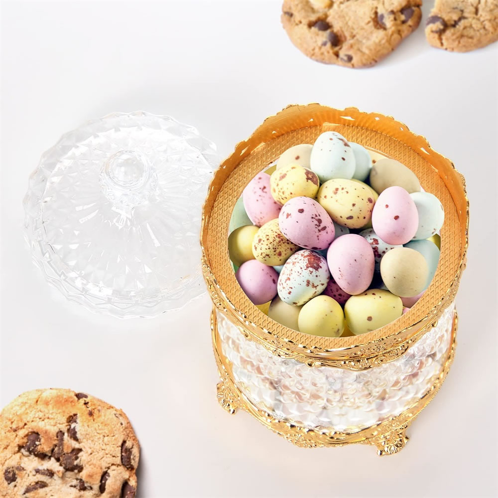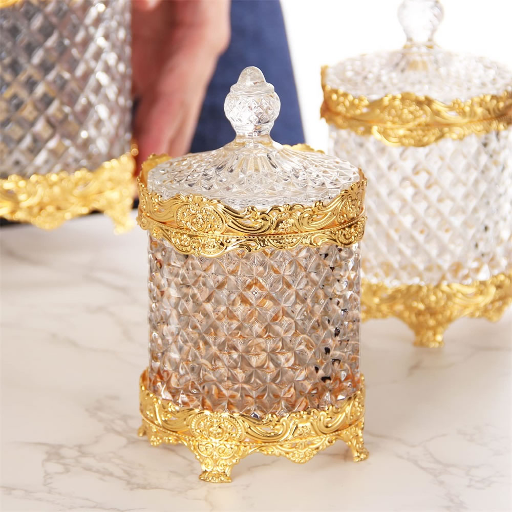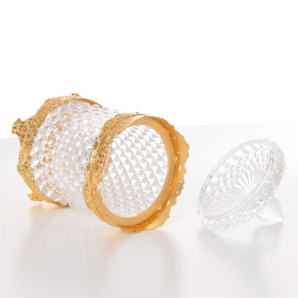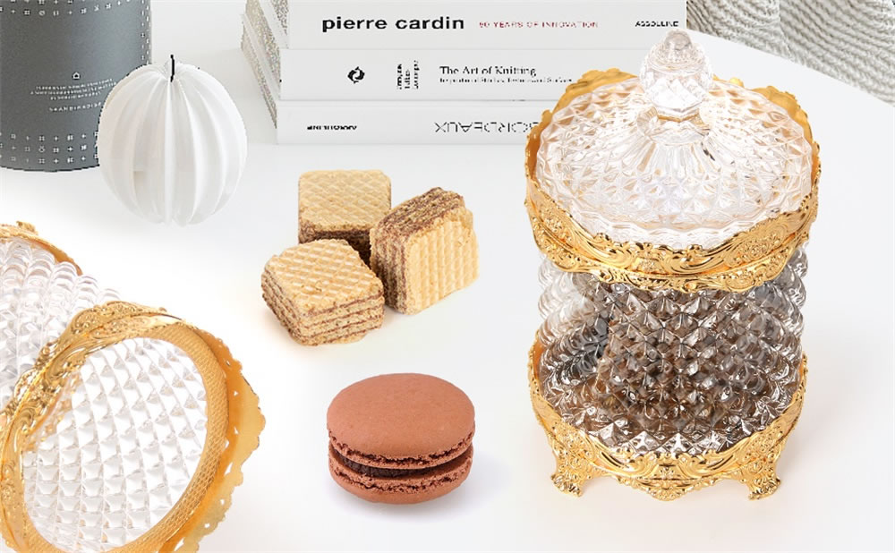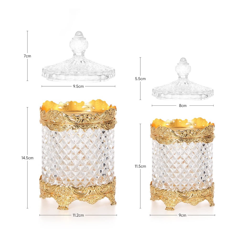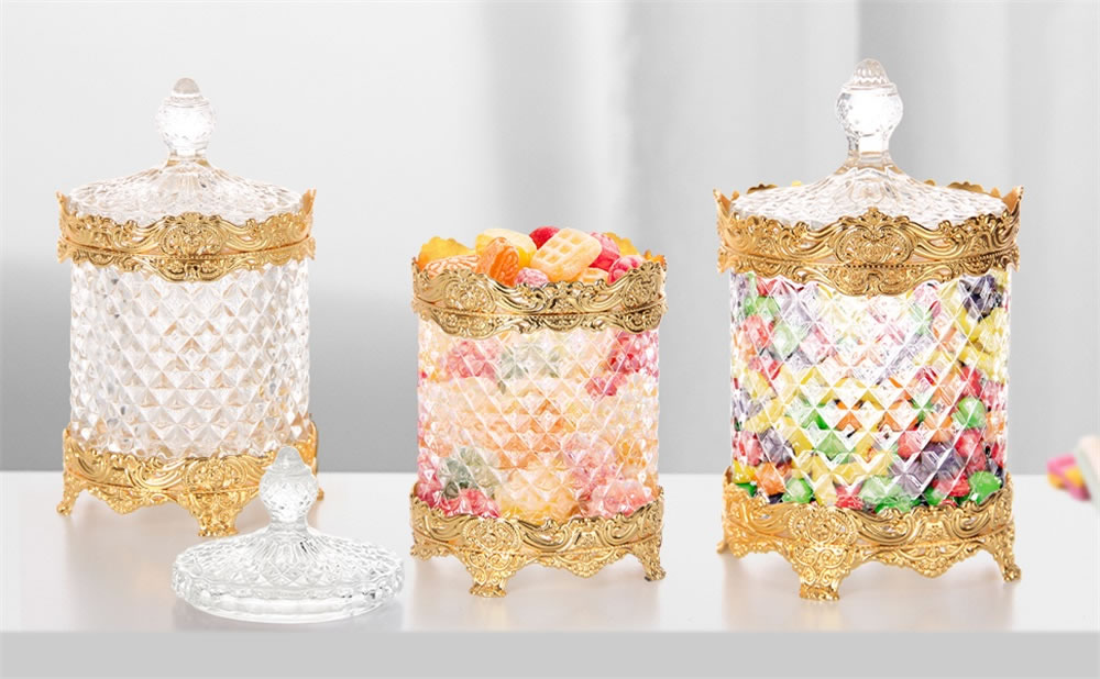 You will definitely be amazed by this exquisite storage container. The storage jars with lids have a beautiful shape, and the transparent glass with golden frame and engraved patterns shows nobility and elegance. It will surely surprise your kitchen or living room and impress with its beautiful appearance.