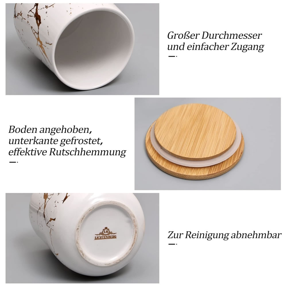 with a shiny glazed look, combined with ceramic and natural bamboo, this porcelain sugar bowl fits most home decors. Oval shapes are easy to catch and remove. The beautiful golden details combine with the smooth, curved contours to give you a fantastic spice jar that will add a touch of sparkle to any kitchen or dining table.