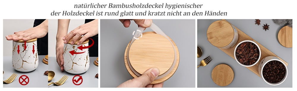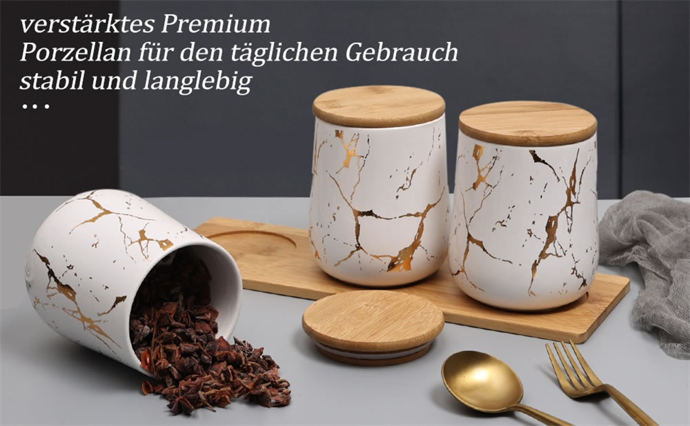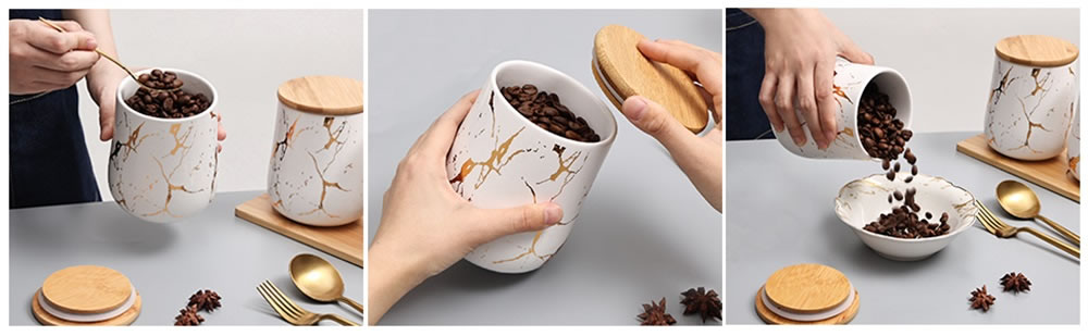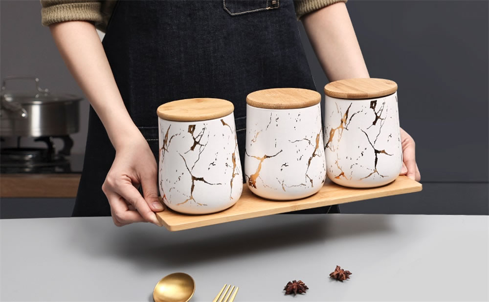 the tank body is made of high-quality ceramic material. Porcelain is fine and round, with thick texture, toughness and durability. The bamboo and wooden parts of the spice jar are made of natural wood material, thick and durable. The wood has the effect of moisture absorption, which is more environmentally friendly, hygienic and beautiful.