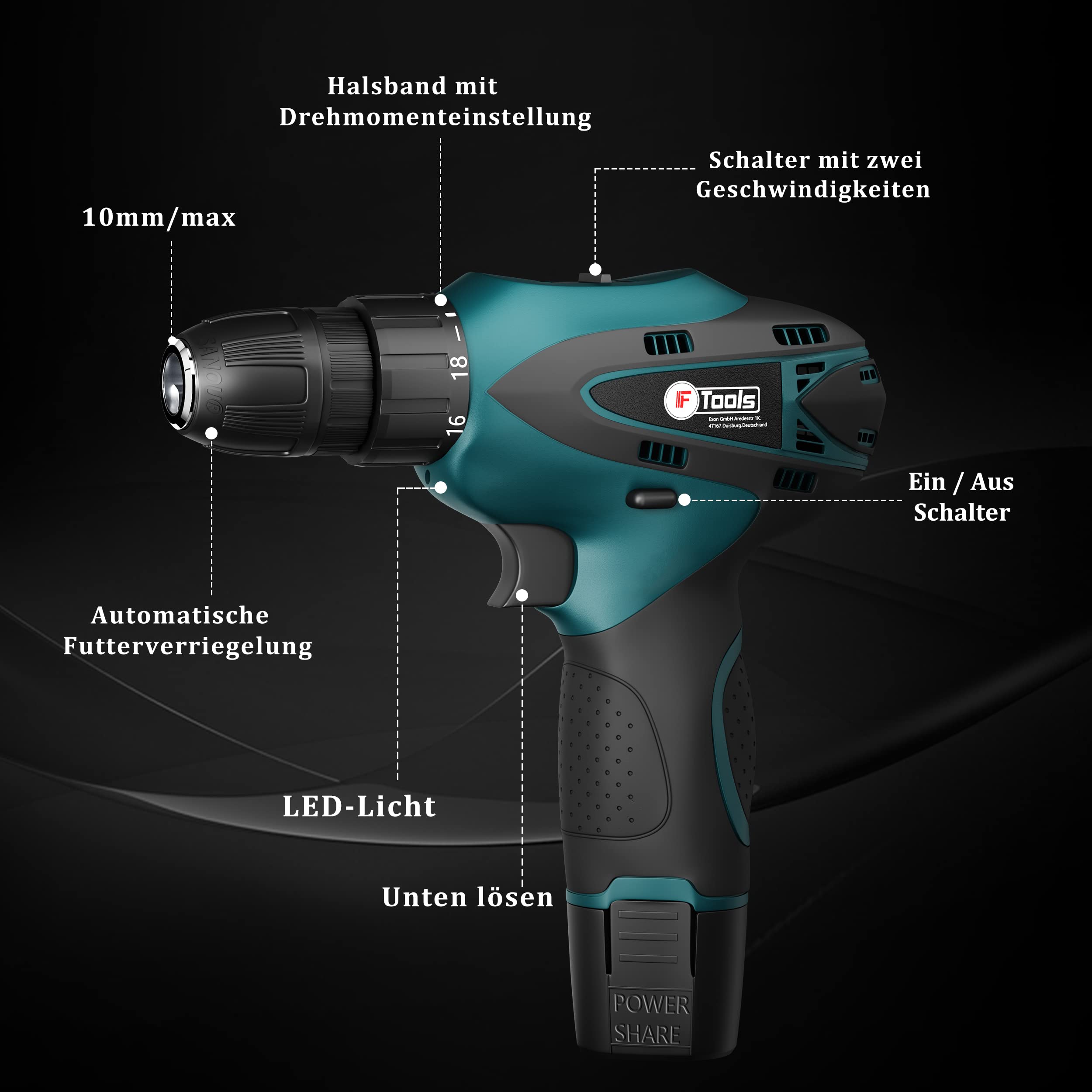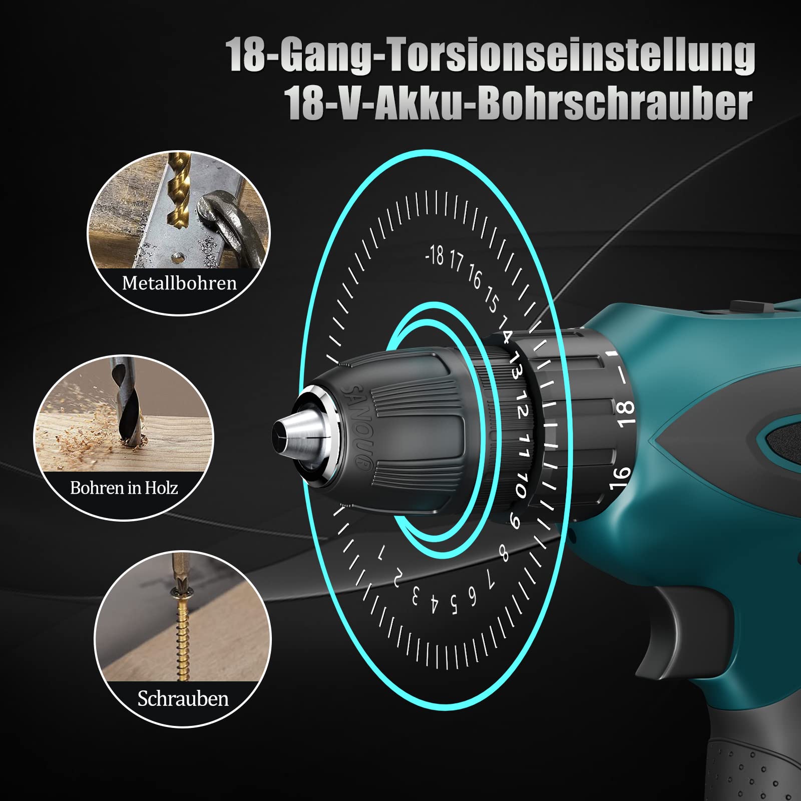 the 18 V cordless screwdriver from IF Tools has 18 different torque settings to precisely control the turning on and off of the drive screw while preventing accidental loosening (0 - 1350 rpm). The super practical electric screwdriver makes it easier to remove and reinforce a wide range of fasteners.