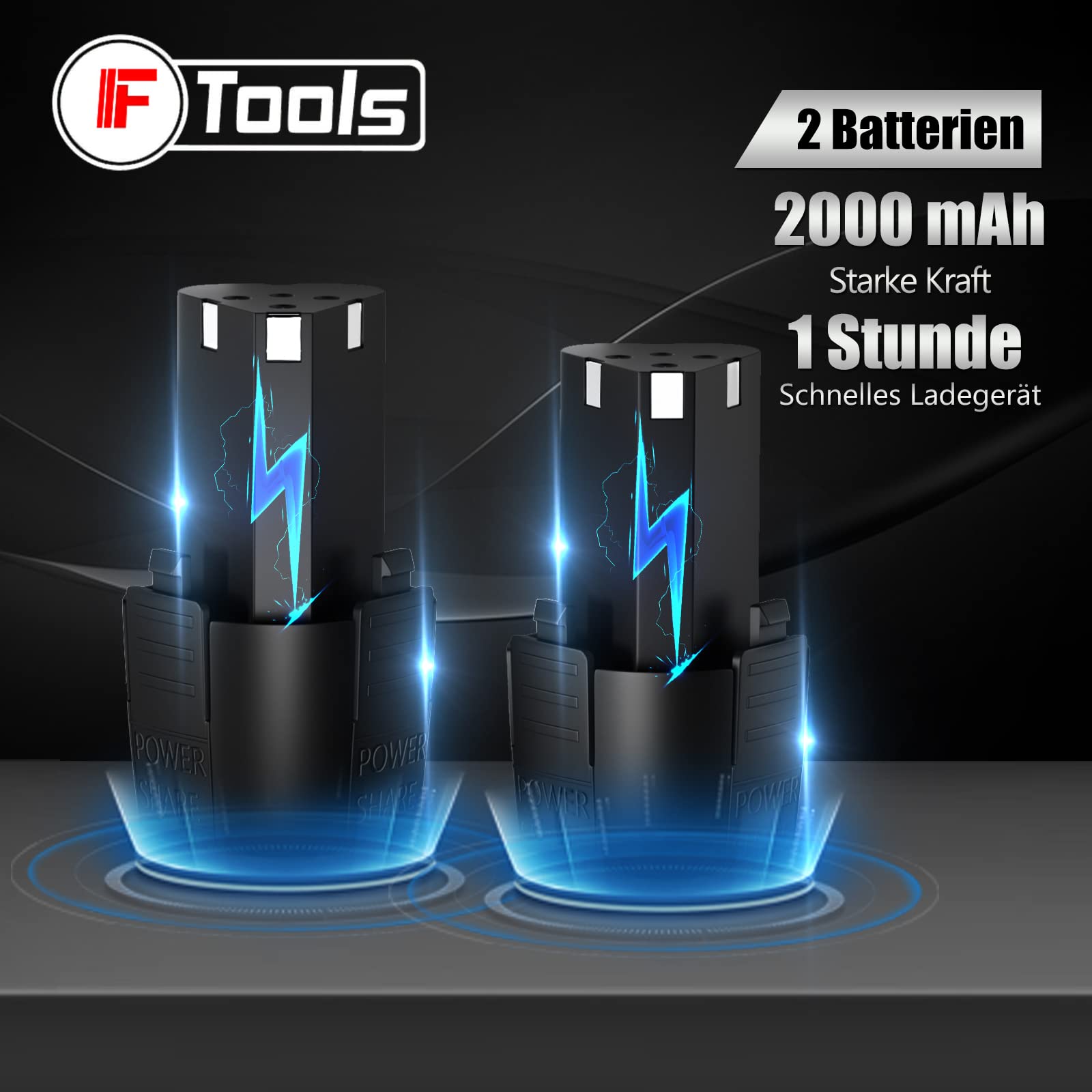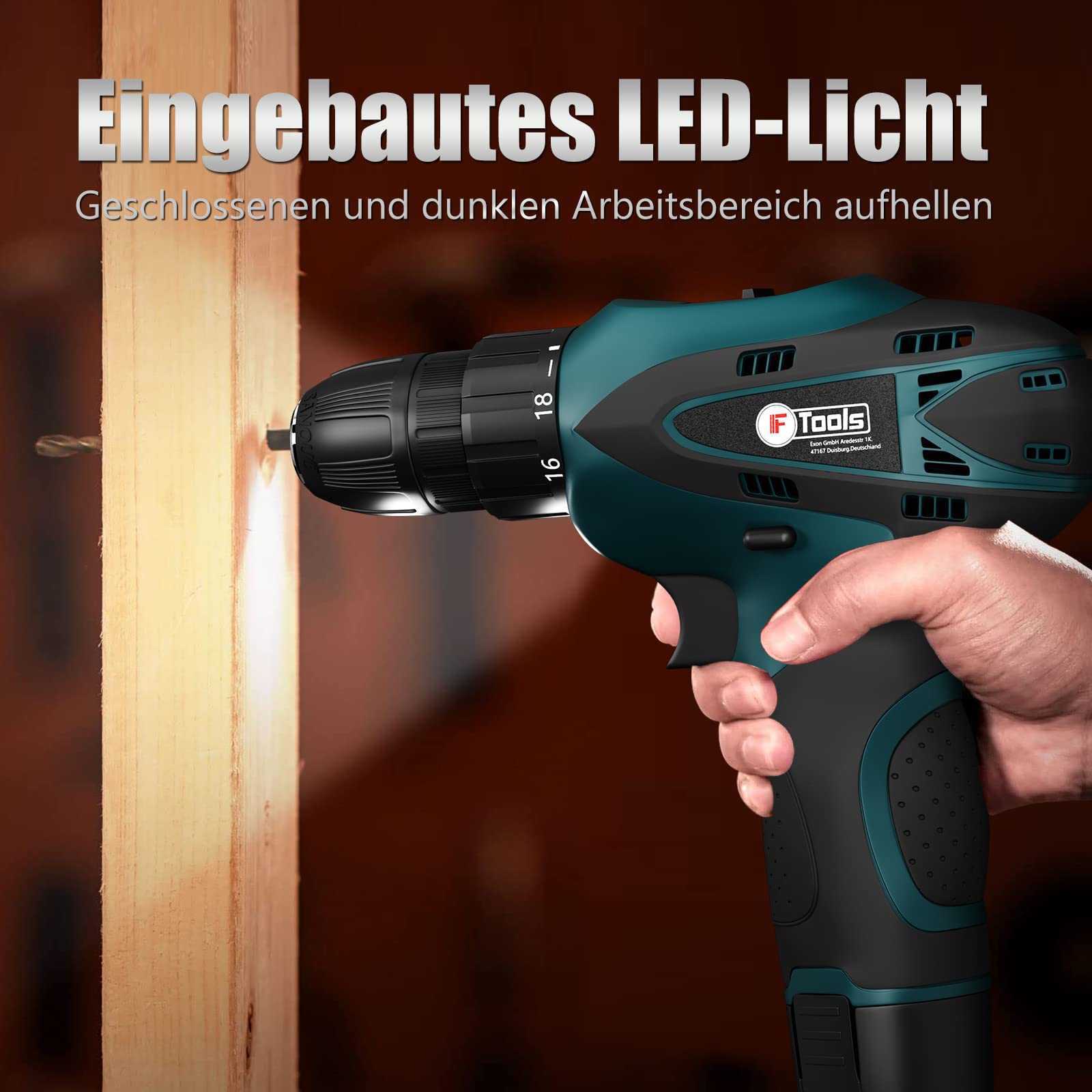 the 18 V battery screwdriver from IF Tools is equipped with 2 1800 mAh batteries and a 1 hour quick charger for strong and stable performance and long runtime. Industrial copper motors provide great performance. This drill has an LED work light. It turns on automatically when the speed control trigger is pressed.